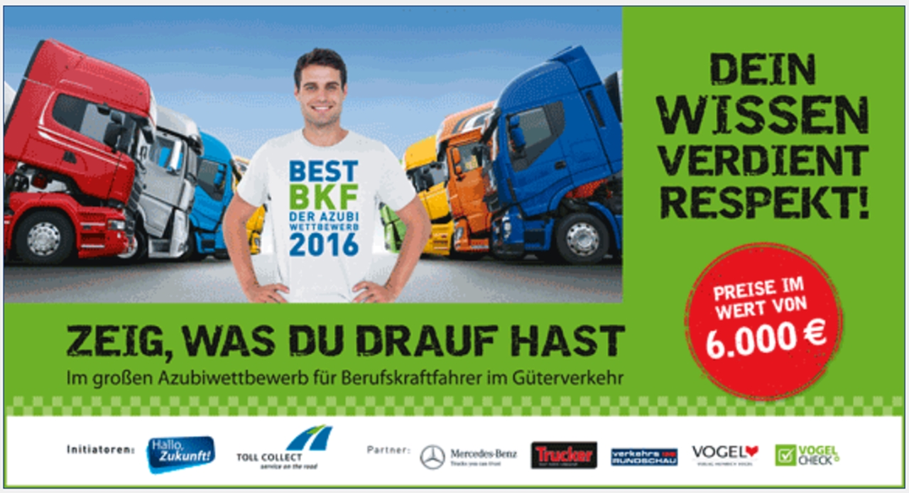 Schon in den vergangenen beiden Jahren brütete der Fahrernachwuchs über die richtigen Antworten auf 40 Fragen zur korrekten Ladungssicherung, Fahrzeugtechnik, Besonderheiten bei Gefahrguttransporten und zur richtigen Einhaltung der Sozialvorschriften. Am 4. Januar startet jetzt mit BEST BKF 2016, die dritte Runde des großen Azubiwettbewerbs für Berufskraftfahrer im Güterverkehr. Der Wettbewerb ist Kernstück der Kooperation zwischen dem deutschen Mautbetreiber Toll Collect und der Nachwuchsinitiative "Hallo, Zukunft!" des Verlags Heinrich Vogel.