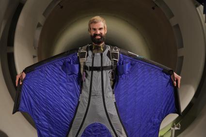 Wingsuit-Jumper. In einer Art Fledermaus-Anzug gleitet er durch die
