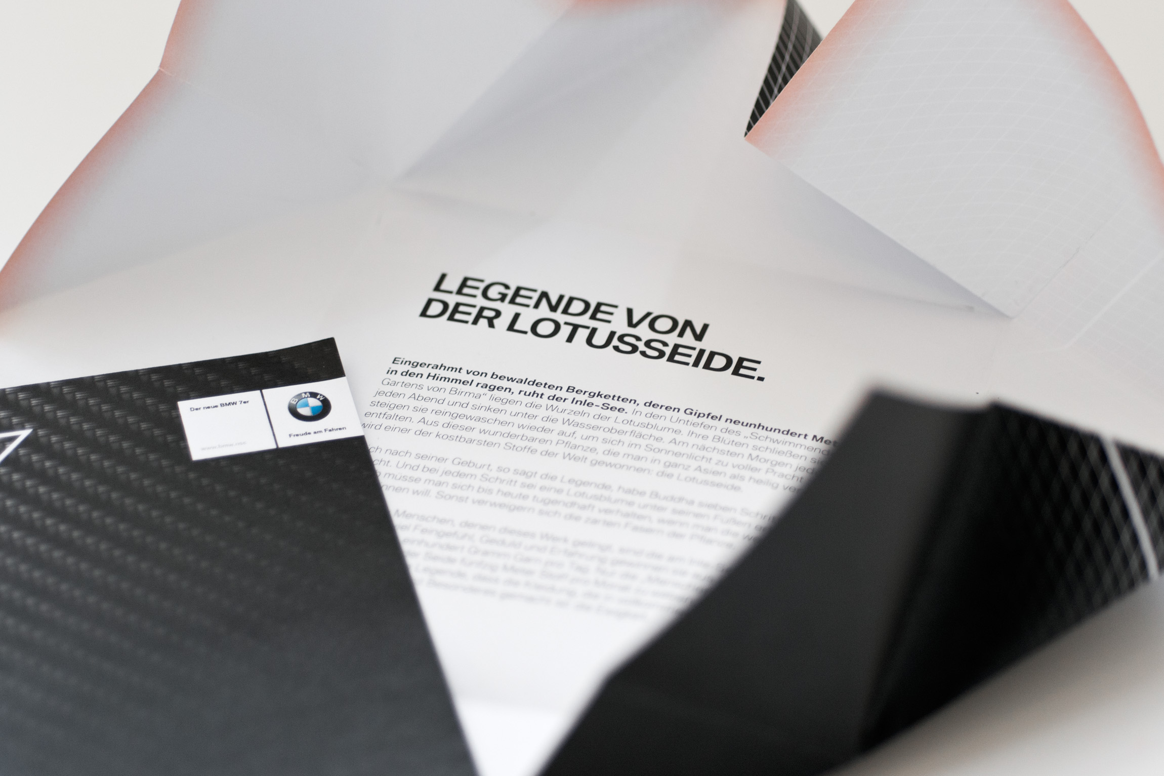 Neben diesem inhaltlichen Ansatz spielen die intelligente Verzahnung von Online- und Offline-Maßnahmen sowie konkrete Response-Elemente eine zentrale Rolle. Die Inszenierung der einzelnen Kommunikationsmittel überrascht, die Umsetzung ist ungewöhnlich und schafft Aufmerksamkeit durch ein ausdrucksstarkes Design. So ist auch die Enthüllung eines der "Secrets of Luxury" immer mit einem Überraschungseffekt verbunden. Das Mailing zum Pre-Launch (on- und offline) erzählt beispielsweise die Legende von der Lotusseide. Der Flyer wurde in einem Wrapping verpackt und der Faltmechanismus öffnet sich wie eine Lotusblüte. Die Give-Aways knüpfen ebenfalls an beide Themen an: Die Empfänger erhalten mit dem Mailing Lotussamen und eine Geldklammer aus Carbon. Weiterhin soll eine Spezialausgabe des BMW Magazins zusammen mit einer gefalteten Banderole verschickt werden. Diese öffnet sich zu einem großformatigen Poster auf dem die Geschichte des "Blauen Wittelsbachers" niedergeschrieben ist. Das visuelle Highlight ist das Gedicht "Lyrik des Lichts", das nur gegen das Licht gehalten lesbar wird. Weitere Maßnahmen sind unter anderem ein aufwändiges Willkommenspaket zum Marktlaunch im Oktober.