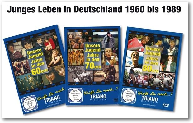 TRIANOmedien produziert seit über einem halben Jahrzehnt für die zwischen 1920 und 1977 Geborenen Jahrgangs-Filme, Kinder-Jahre- sowie Jugend-Jahre Filme. Alle zu 100 % aus historischem Filmmaterial. Filmmaterial aus den Filmarchiven von TRIANOmedien, das Sie nur auf den DVDs von TRIANOmedien sehen können.
