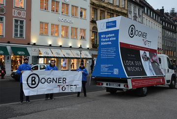 Damit Bogner auf die Forderungen des Deutschen Tierschutzbüros aufmerksam wird, steht am Samstag, den 09. Januar zwischen 13 und 18 Uhr der Plakat-Wagen des Tierschutzvereins an der Frankfurter Bogner-Filiale in der Goethestraße 21. Das auf dem Wagen befindliche Plakat zeigt auf 2x4 Metern eine provokante Abbildung, die bereits für viel Aufsehen sorgte. Zudem werden Passanten und Kunden mit Flyern von Aktivisten des Deutschen Tierschutzbüros direkt über den Pelzhandel aufgeklärt. Um 13.30 Uhr informieren die Mitarbeiter die Presse über die Kampagne und den Einsatz des Plakat-Wagens, der in den kommenden Wochen bundesweit vor Bogner-Filialen zu sehen sein wird.