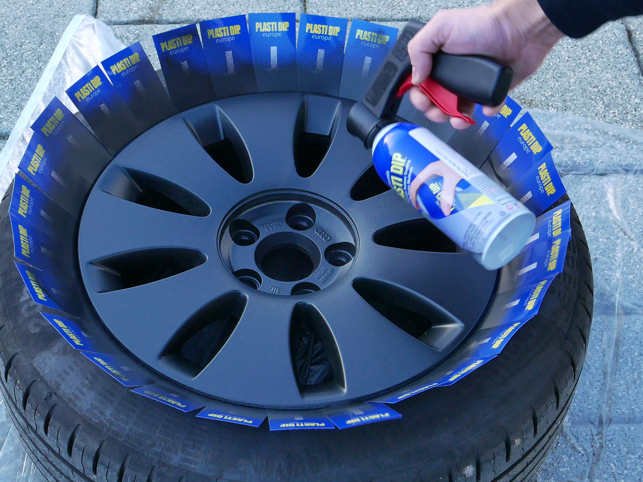 Das Besprühen der Felgen, das so genannte "Dippen", ist relativ problemlos möglich. Dazu müssen die Reifen nicht demontiert werden, sondern nur die Felgen gründlich gereinigt. Das Aufsprühen sollte an einem trockenen Ort und nicht bei Kälte erfolgen. Mit den mitgelieferten Sprühkärtchen wird der Reifen vor Sprühnebel geschützt, sie werden wie ein Fächer zwischen Felge und Reifen gesteckt. Das Aufsprühen des Plasti Dips erfolgt in mehreren Schichten. Die Plasti Dip Felgenfolie lässt sich wie eine Farbsprühdose anwenden. Zwischen den einzelnen Schichten lässt man die Sprühfolie trocknen. Für einen individuellen Look kann man anschließend mit Plasti Dip Effektsprays weitere Farbtöne auftragen, so wie die neuen orangen oder saphirblauen Metalliceffekte von Plasti Dip.