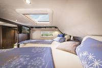 Rechts vom Eingang betritt man den ?privaten? Bereich des Mobils. Das Raumbad mit separater Toilette wird zum Wohnraum durch eine Klapptür und zum Schlafzimmer durch eine Schiebetür abgetrennt. Das Schlafzimmer im Alkoven hat zwei Längseinzelbetten und eine komfortable Höhe von 80 Zentimetern. Dieses Schlafzimmer ist wirklich toll. Es vermittelt weniger das Ambiente einer Alkoven-Koje, sondern viel mehr die großzügige Dimension eines Liner-Schlafzimmers mit einmaligem Schlaf-Erlebnis.