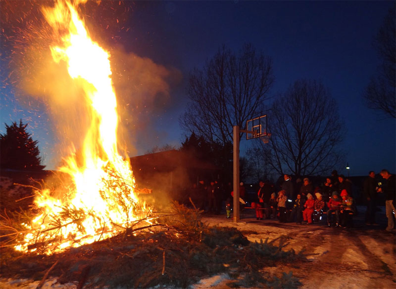 Bei schönem Winterwetter kamen dann die Bürger in den Nachmittagsstunden am Dorfgemeinschaftshaus in Renneritz zusammen, um das neue Jahr nochmal gemeinsam willkommen zu heißen und sich von den Tannenbäumen und damit auch von der Weihnachtszeit endgültig zu verabschieden. Der Heimatverein sorgte mit deftigen Bratwürsten, süßen Waffeln, heißem Glühwein und Kinderpunsch für die passende Versorgung der Gäste. Mit Einsetzen der Dämmerung wurden die alten Weihnachtsbäume entzündet. Mit lautem Knistern wurde Baum für Baum ein Opfer des Feuers, welches dadurch hell und wärmend zugleich war.