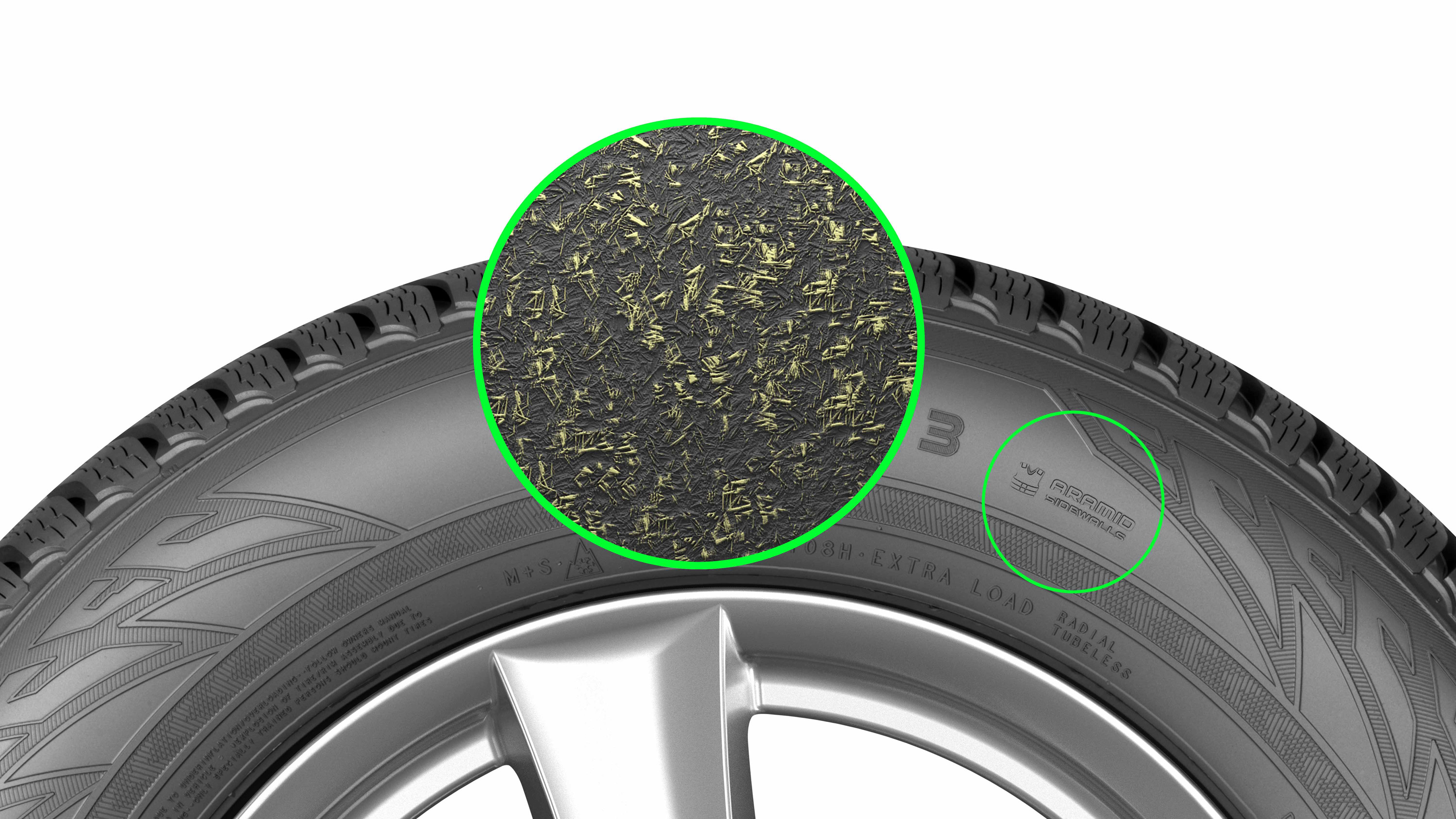 Die Aramid-Fasern, die Nokian Tyres in der Reifen-Seitenwand nutzt, versteifen und verstärken die Seitenwand des Pneus und macht sie widerstandsfähiger gegen Schäden und Schnitte, die leicht zu einer Reifenpanne führen können. Dieses hochfeste Aramid bewährt sich auch in der Flugzeug- und Rüstungsindustrie bestens.