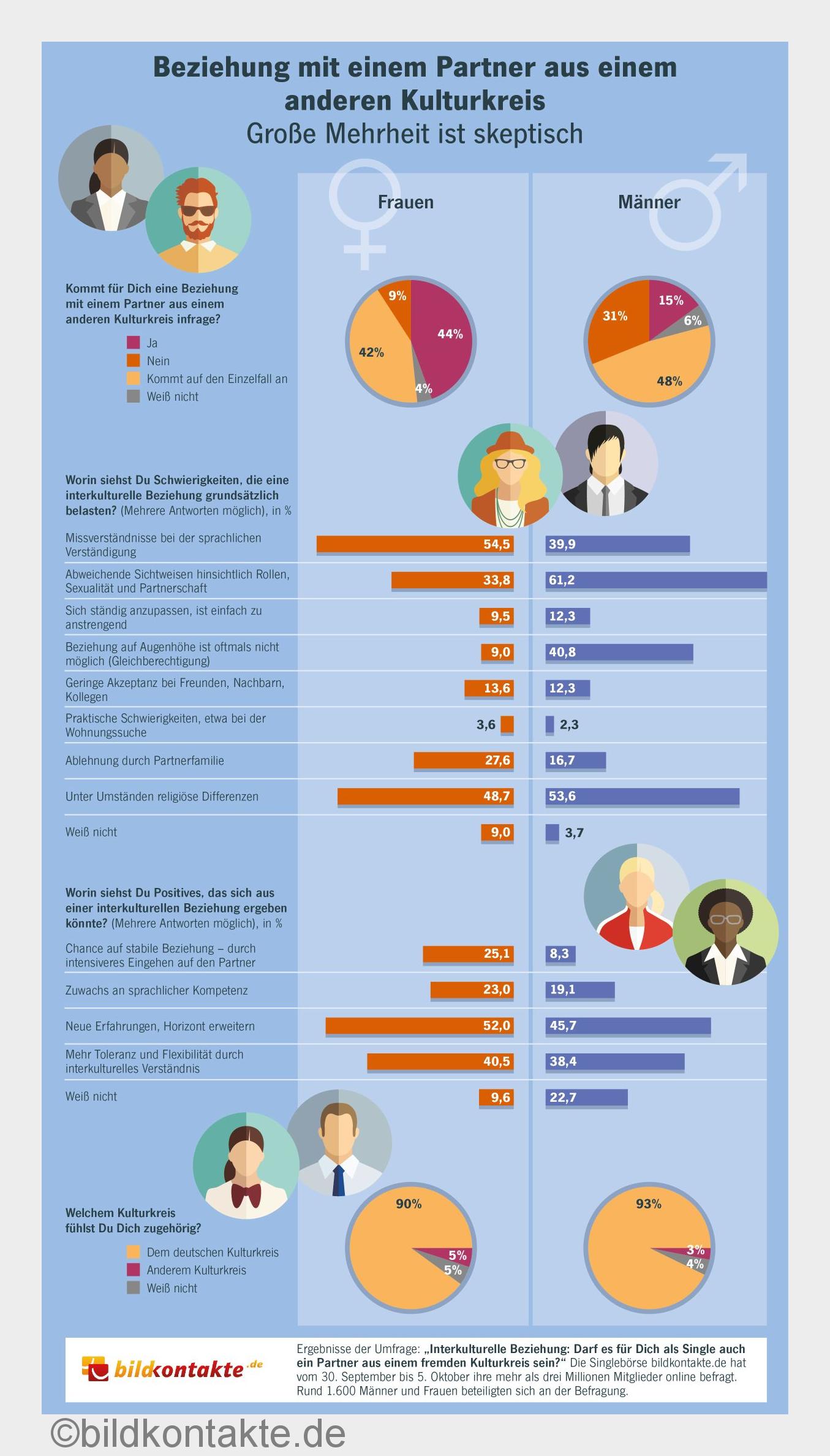 Insbesondere Männer haben grundlegende Vorbehalte: Für nur 15 Prozent kommt eine Frau aus einem anderen Kulturkreis als Partnerin überhaupt infrage. "Nahezu jeder dritte Mann (31 Prozent) schließt eine solche Beziehung kategorisch aus", erläutert Christian Kirschey, Geschäftsführer von bildkontakte.de. Bei den Frauen sind es sogar 51 Prozent, die einer bikulturellen Partnerschaft eher ablehnend gegenüberstehen oder das Zustandekommen bestenfalls vom Einzelfall abhängig machen.