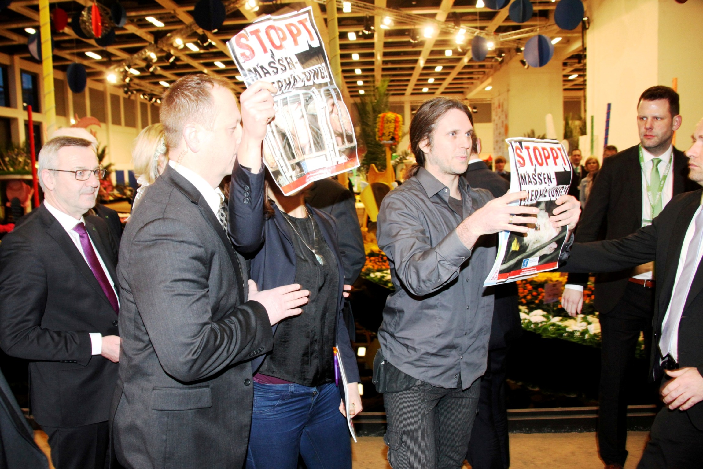 Mehrere Aktivisten des Deutschen Tierschutzbüros e. V. störten heute massiv den Presserundgang zur Eröffnung der Grünen Woche.