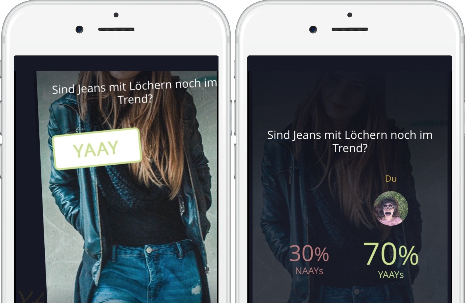 Den Usern wurde ein neues Konzept an die Hand gegeben, das den Prozess des Meinung-Gebens und -Sammelns vereinfacht sowie den Spaß und Usernutzen steigert. Mit einem Links-/NAAY- oder Rechts-/YAAY-Wisch mussten sich die User bei jedem Foto entscheiden, abstimmen und ihre Meinung preisgeben. Mit wenigen Klicks konnten eigene Abstimmungen erstellt werden.