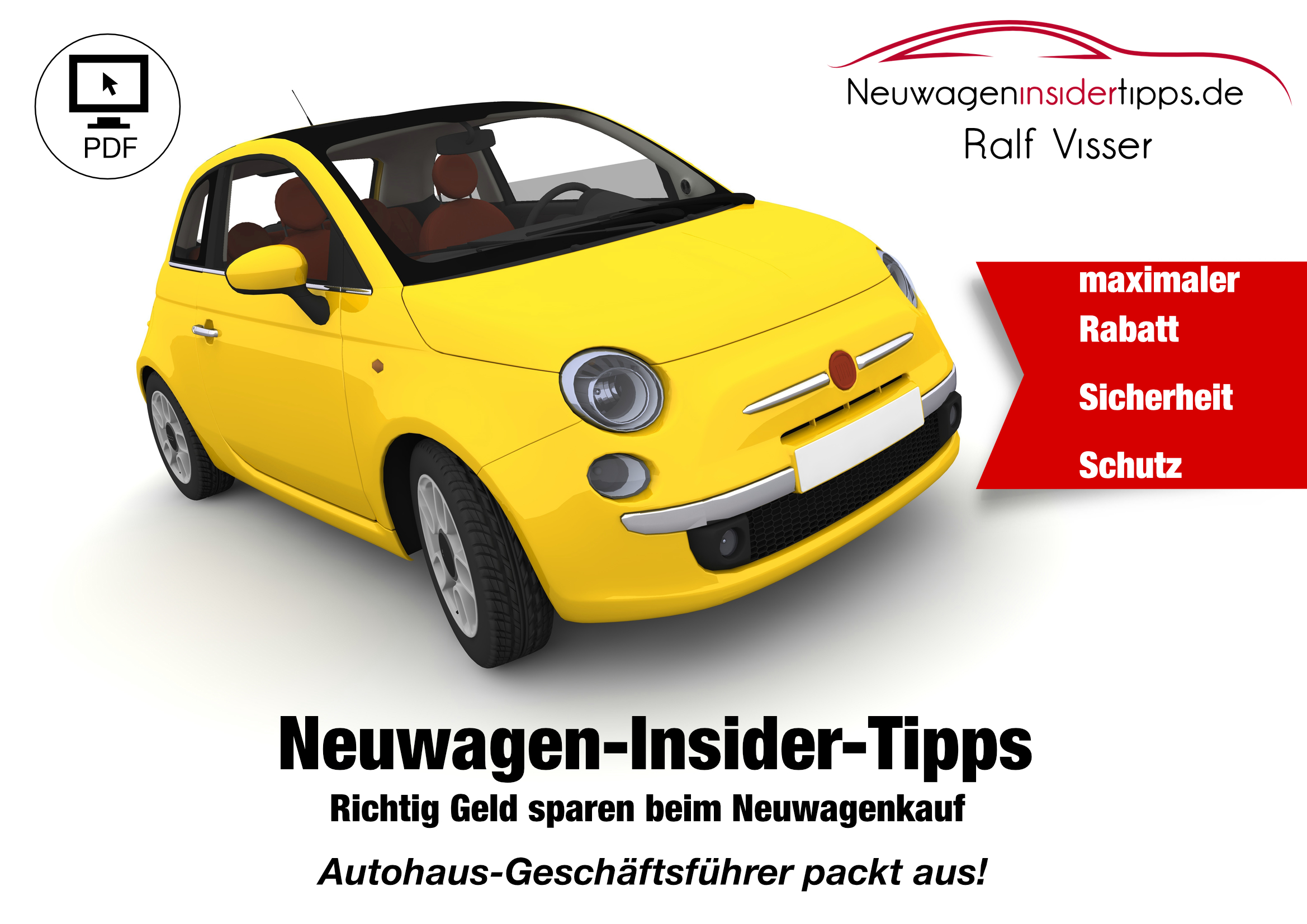 Ralf Visser hat all seine Erfahrungen der letzten 30 Jahre in einem E-Book dokumentiert. Als Ratgeber aufgebaut klärt das Buch auf und verrät die geheimen Praktiken der Automobil Hersteller und der Autoverkäufer. Es schützt die Leser vor Täuschung, Manipulation und vor Betrug beim Fahrzeugkauf und kostet weniger als 3 Liter Motorenöl. Der größte Benefit der Dienstleistung ist jedoch die Rabatt Optimierung: