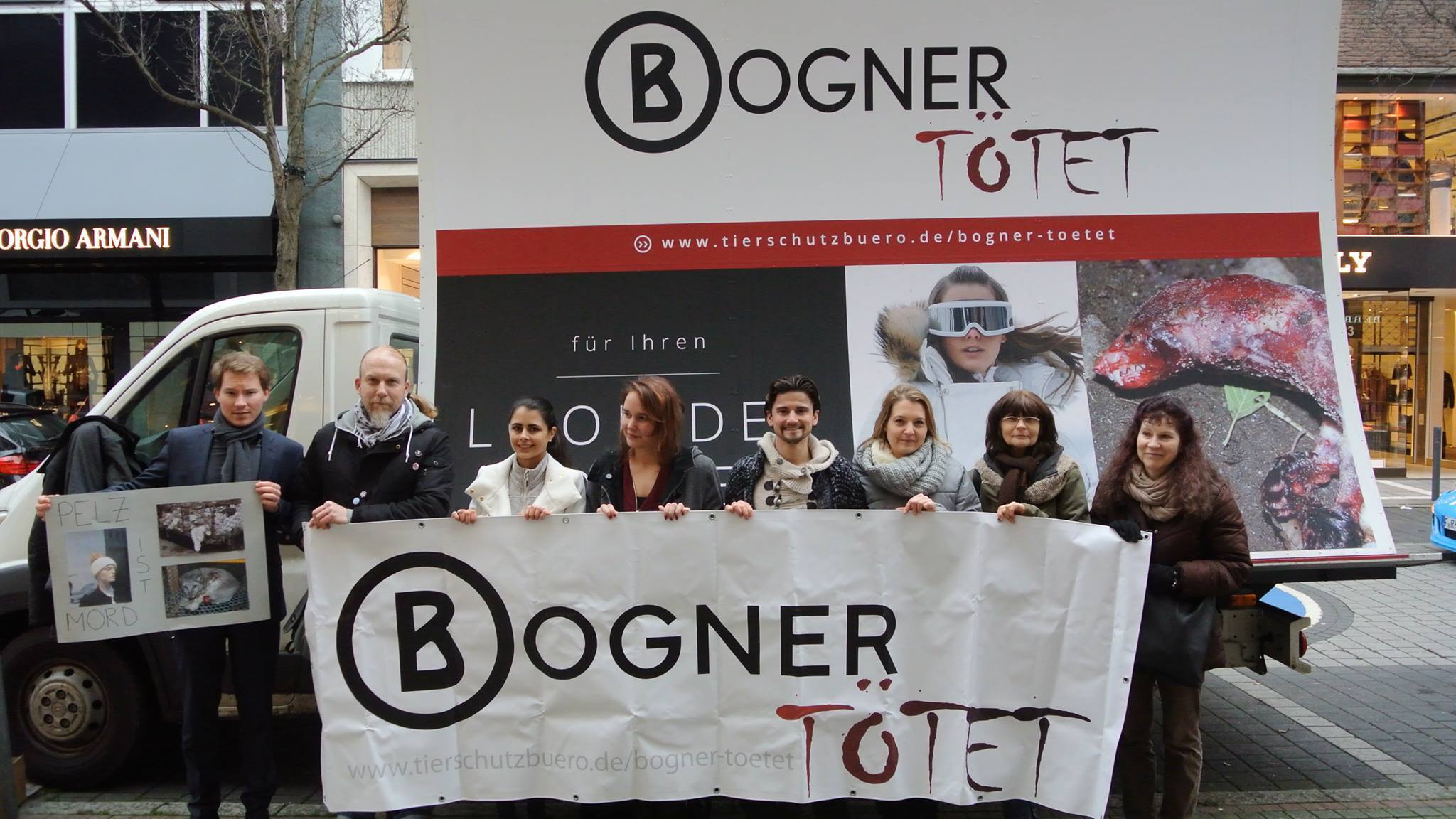 Damit Bogner auf die Forderungen des Deutschen Tierschutzbüros aufmerksam wird, steht am Donnerstag, den 21. Januar zwischen 11 und 18 Uhr der Plakat-Wagen des Tierschutzvereins an der Stuttgarter Bogner-Filiale (Lange Straße Ecke Königsstraße). Das auf dem Wagen befindliche Plakat zeigt auf 2x4 Metern eine provokante Abbildung, die bereits für viel Aufsehen sorgte. Zudem werden Passanten und Kunden mit Flyern von Aktivisten des Deutschen Tierschutzbüros direkt über den Pelzhandel aufgeklärt. Um 16 Uhr informiert der Mitarbeiter die Presse über die Kampagne und den Einsatz des Plakat-Wagens, der inzwischen bundesweit vor Bogner-Filialen unterwegs ist.