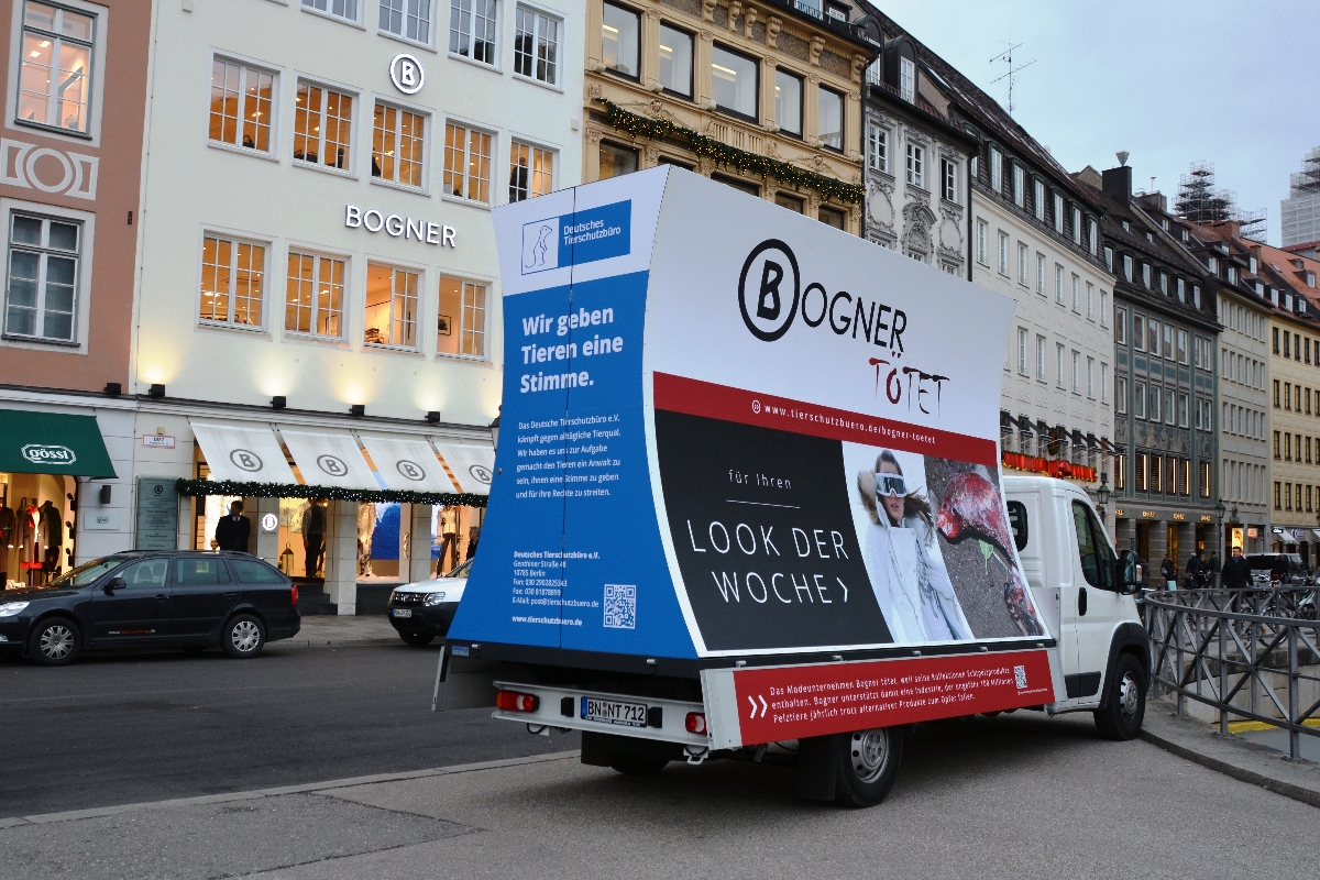 Damit Bogner auf die Forderungen des Deutschen Tierschutzbüros aufmerksam wird, steht am Freitag, den 22. Januar zwischen 14 und 18 Uhr und am Samstag zwischen 11 und 18 Uhr erneut ein Plakat-Wagen mit einem 4x2 Meter großem Banner gegenüber der Münchener Bogner-Filiale. Passanten und Kunden können direkt über den Pelzhandel aufgeklärt werden, denn das Auto wird zudem von einem Mitarbeiter des Deutschen Tierschutzbüros betreut. Um 15 Uhr informiert er die Presse über die Kampagne und den Einsatz des Plakat-Wagens, der inzwischen bundesweit vor Bogner-Filialen unterwegs ist.
