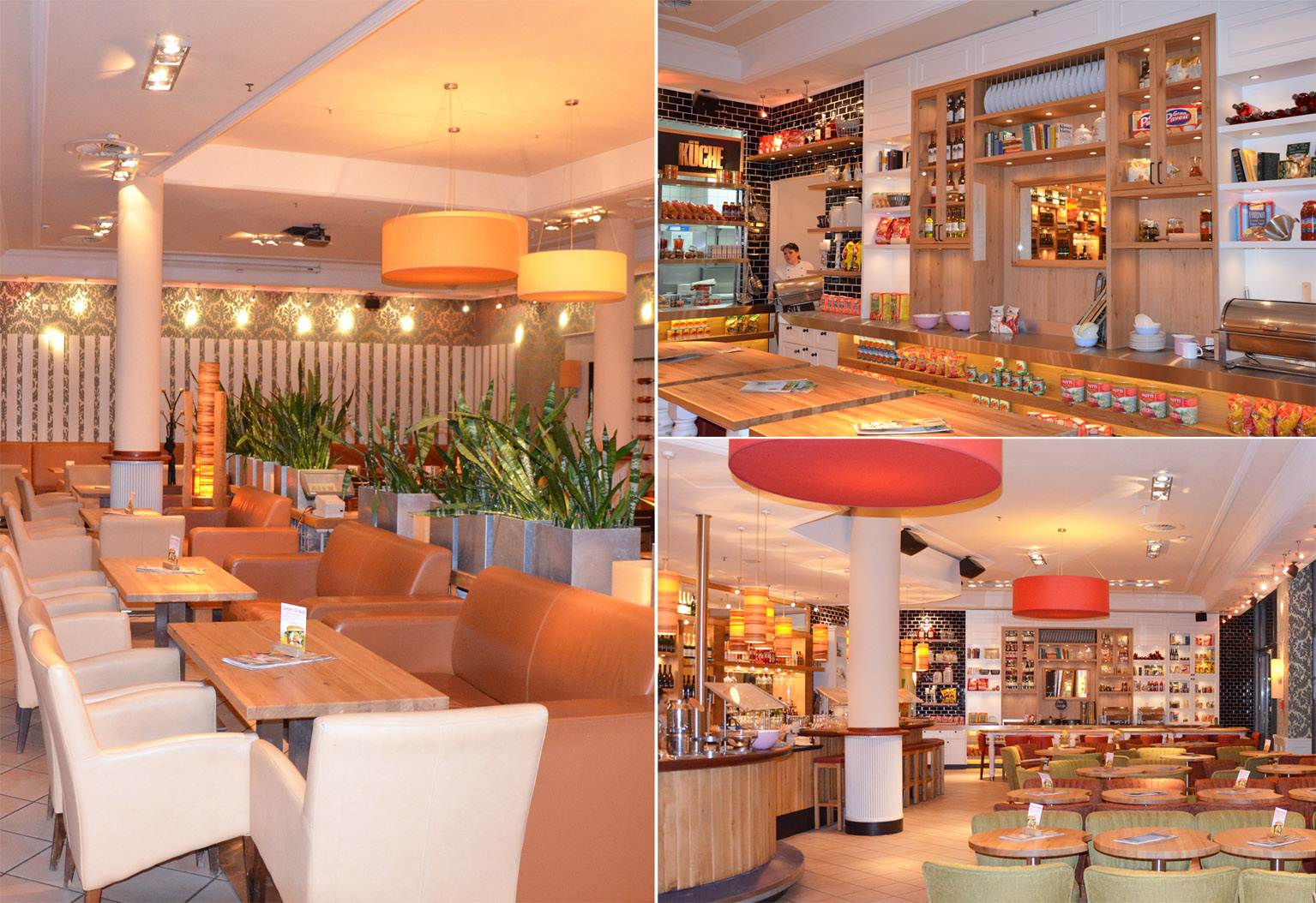 Das neue Herzstück des ALEX ist eine komplett einsehbare, offene Küche, die sich in den Gastraum hinein als Living-Kitchen-Bereich mit hohen Vitrinenschränken vor schwarzen Wandfliesen und Küchenregalwänden fortsetzt. Von hier aus kann man den Köchen auf die Finger schauen, wenn sie die Gerichte vor den Augen der Gäste frisch zubereiten ? vom sensationellen Frühstücksbuffet (ALEX ist mit rund zwei Millionen verkauften Frühstücken deutschlandweit die Nummer Eins im Morgengeschäft) über Burger, Steak und Pasta bis hin zu Salat und Thai-Curry. ALEX serviert auch frisches Brot aus dem eigenen Backofen, das den Gastraum verführerisch duften lässt.