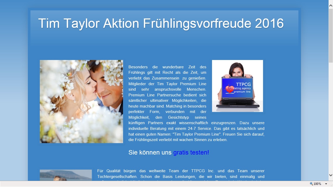 Neue Mitglieder, welche die geringen Gebühren für das eigene Partnerglück schnell bezahlen, werden von der Tim Taylor Partner Computer Group mit wertvollen Bonuspräsenten dafür belohnt. Derzeit werden in Deutschland, Österreich und der Schweiz u.a. Reisen geboten. Das Angebot reicht von einem Hotelgutschein mit einer Seekreuzfahrt und abendlichem Krimidinner bis zu einer Woche Traumurlaub am Gardasee. Das reizt natürlich. Denn in den meisten Fällen erleben die Tim Taylor Mitglieder einen Traumurlaub frisch verliebt mit dem wirklich passenden Partnerglück. Ein moderner Weg, den viele Singles in derzeit 22 Ländern gehen. Auch wenn der Hauptsitz von Tim Taylor Partner Computer Group Inc. in den USA liegt, besteht das Ziel darin, den Zugang zu hochwertigen und kostengünstigen Dienstleistungen weltweit und in jeweiligen Landessprachen zu bieten. Um dieses Ziel zu verwirklichen, hat TTPCG (http://www.ttpcg.com/dasoriginal) Standorte in zahlreichen Ländern aufgebaut und unterhält mehr als tausende Webseiten. Das alles nur, um Ziele erlebbar zu machen. Ein Ziel, das viele Millionen Singles weltweit Tag und Nacht vor Augen haben: Eine von Harmonie geprägte Partnerschaft mit dem Menschen an der Seite, der perfekt zum eigenen Wesen passt. Dafür ist das Tim Taylor Team da. Ein Team in einem der fortschrittlichsten Unternehmen der Welt, einem Unternehmen, das niemals schläft.