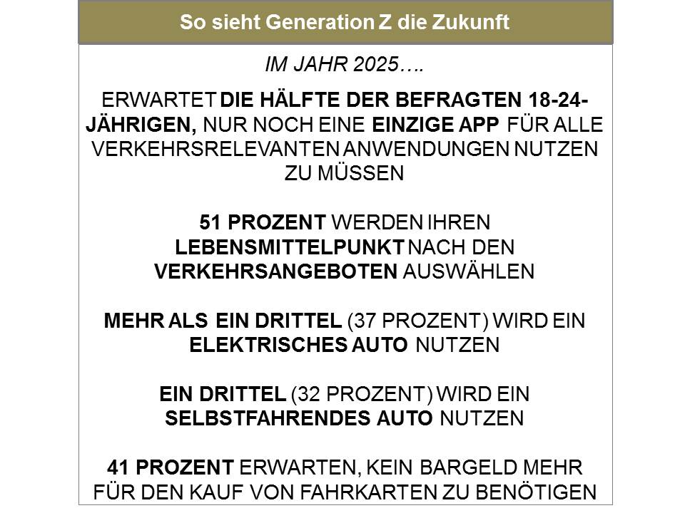 An der Studie nahmen rund 1.200 junge Menschen in insgesamt zwölf Städten in Großbritannien, Frankreich, Deutschland, Belgien und den Niederlanden teil. Eines der Ergebnisse: Ein knappes Drittel der Befragten rechnet damit, spätestens 2025 mit selbstfahrenden Autos unterwegs zu sein. Insgesamt 41 Prozent glaubt, bald kein Bargeld mehr für öffentliche Verkehrsmittel mehr zu brauchen. Mehr als die Hälfte der Studienteilnehmer hält die Verfügbarkeit geeigneter Transportmöglichkeiten künftig für entscheidend für die Wahl des Wohn- und Arbeitsorts.
