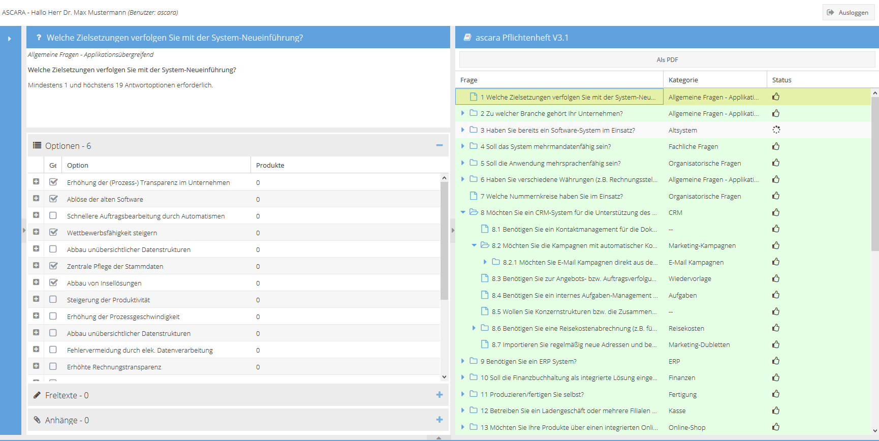 Bei der gemeinsamen Erarbeitung des Pflichtenheftes werden grundlegende Fragen gestellt, die je nach Antwortoption dann im weiteren Verlauf detaillierter erörtert werden. Um im Zweifelsfall Antworten noch abzuändern, kann eine neue Version des Pflichtenheftes erstellt werden. Die Fragen bauen logisch aufeinander auf und helfen somit die wichtigen Punkte bei einer Neueinführung der Software anzusprechen.