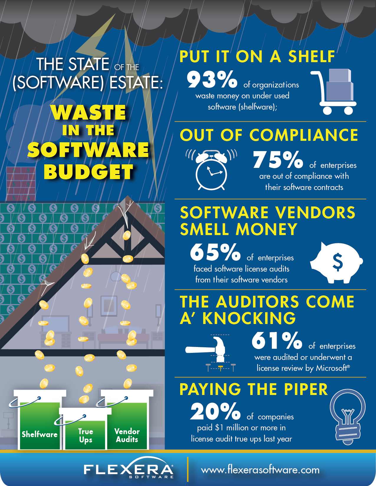 (IINews) - München, 27. Januar 2016 - Flexera Software (http://www.flexerasoftware.de/enterprise/company/about/?utm_source=marketwire&utm_medium=PR&utm_campaign=AUV4-2015-ClimateChangeDenial), ein führende Anbieter von Software-Lizenzierung, Compliance, Security- und Installations-Lösungen für Softwarehersteller und Unternehmen, hat die neue Studie The State of the (Software) Estate: Waste Is Running Rampant in Enterprises (http://learn.flexerasoftware.com/SLO-WP-State-Software-Estate-Survey?utm_source=marketwire&utm_medium=PR&utm_campaign=PricLic2016%231-Audits%26Compliance) veröffentlicht. Diese zeigt: Die meisten Unternehmen schaffen es ungeachtet stagnierender IT- Budgets nicht, durch effektives Softwaremanagement Kosten einzusparen. Potentielle Einsparungspotentiale sieht der Report im Bereich Shelfware, also Software die kaum oder nicht genutzt wird. Oft entspricht die Softwarenutzung zudem nicht den vertraglich vereinbarten Compliance-Richtlinien. Audits der Softwareanbieter verursachen weitere hohe Kosten, z. B. in Form von True-up-Nachzahlungen im oft siebenstelligen Bereich.