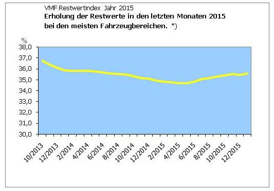 Der VMF-Restwert-Index (RWI) berechnet den durchschnittlichen Händlereinkaufspreis von typischen Fuhrparkfahrzeugen. Die Bewertung erfolgt monatlich und wird dann zu der unverbindlichen Preisempfehlung (UPE) der Hersteller für ihre Neuwagen in Bezug gesetzt. Im Juni wies der Wert noch 34,9 Prozent der UPE aus - nach einer 1 1/2 Jahre dauernden Abwärtsbewegung. Seitdem geht es wieder bergauf. "Die Restwerte haben sich im Laufe des Jahres kontinuierlich - wenn auch noch auf relativ niedrigem Niveau - auf 35,4 Prozent erholt", sagt Velte. Mit dem RWI bietet der VMF ein Instrument, mit dem Trends und konkrete Entwicklungen frühzeitig erkannt werden können. "Das ist für eine realistische Restwertkalkulation wichtig, welche. bekanntlich ein wichtiger Faktor zur Berechnung der Leasingrate ist", so Velte. Der Index beinhaltet aus gegebenem Anlass aktuell nur die Fahrzeuge der beiden Hersteller VW und Audi, die nicht von dem Abgasskandal betroffen sind, um die Restwertentwicklung ohne diesen Sondereinfluss betrachten zu können.