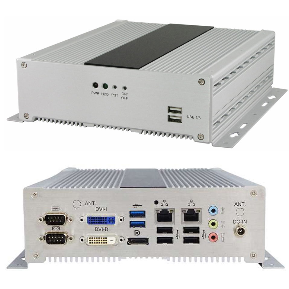 Für die Netzwerkkonnektivität besitzt der Embedded-PC 2x Gigabit-LAN und kann optional mit einem WLAN-Modul ausgestattet werden. Die Grafikausgabe erfolgt über DVI-I, DVI-D und Displayport. Darüber hinaus besitzt der Embedded-PC zwei RS232-Schnittstellen, sowie 6x USB 2.0 und 2x USB 3.0 Ports. Auf der 100GB großen Festplatte können sowohl Windows als auch Linux Betriebssysteme installiert werden. Für die notwendige Stromversorgung sorgt ein externes 12VDC Netzteil. Mit seinen kompakten Maßen von (BxTxH) 232x199x64 mm kann der Embedded-PC per Wallmount nahtlos in sein Arbeitsumfeld integriert werden.