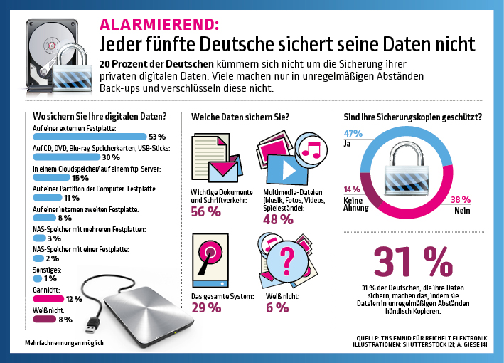 20 Prozent der Deutschen kümmern sich nicht um die Sicherung ihrer privaten digitalen Daten. Bei einer aktuellen repräsentativen Umfrage gaben 12 Prozent der Befragten an, dass sie ihre Daten nicht sichern. Weitere 8 Prozent wussten es nicht.