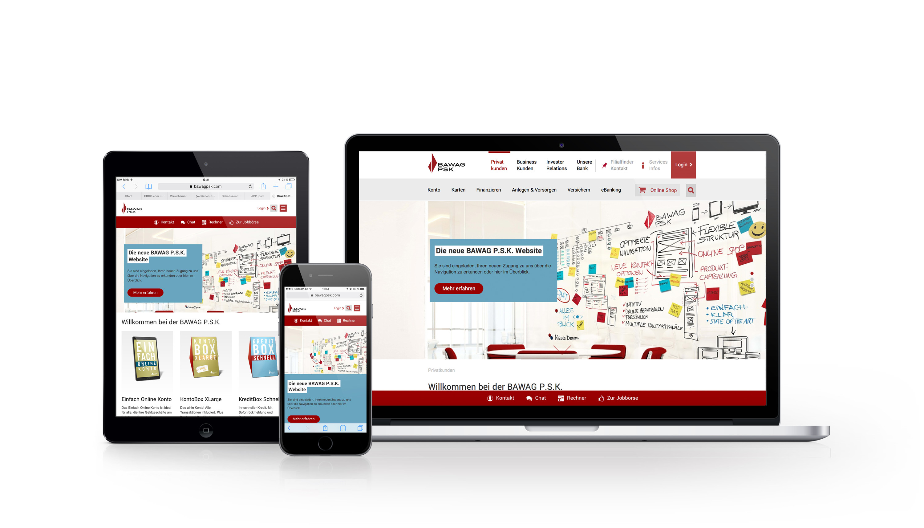 "Ein wesentlicher Fokus des Relaunchs lag in der kreativen Entwicklung eines durchgängigen visuellen Erlebnisses auf Neuromarketing-Basis sowie einer optimierten User Experience", beschreibt Ralf Pispers, CEO von .dotkomm. Zur Schaffung einer übersichtlichen Seitenstruktur und einer optimalen Nutzerführung setzt die Website auf implizites Design. Basierend auf dem Framework Bootstrap folgt diese zudem einer responsiven Darstellung und wird auch auf mobilen Endgeräten optimal präsentiert. Die neue Website der BAWAG P.S.K. bildet so die Basis für mehr Response und Conversion in einer wachsenden mobilen Online-Welt. Darüber hinaus bietet die Website ein erweitertes Service- und Leistungsspektrum. So assistieren smarte Produktfinder bei der Auswahl des passenden Produktes. Kurzvideos helfen beim Eröffnen eines neuen Kontos oder bei anderen Dienstleistungen der Bank.