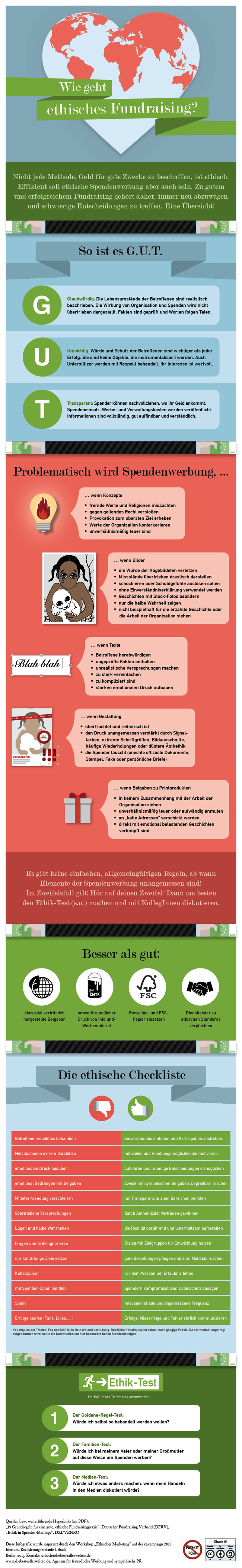 Eine Infografik der Kommunikationsagentur "Die beste aller Welten" soll Fundraisern zumindest bei den ethischen Standards, wie sie zum Beispiel von DZI/VENRO und DFRV ausgearbeitet wurden, eine plakative Übersicht bieten. Die illustrierte Grafik listet diese Punkte und Fragen übersichtlich auf, zeigt die Dos und Don''ts und schlägt zu letzteren alternative Herangehensweisen vor.