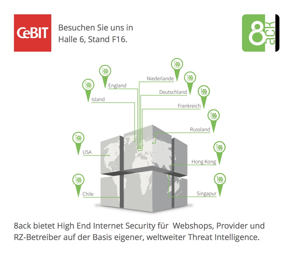 (IINews) - Kiel, 3. März 2016 - 8ack (gesprochen: Attack), ein führender deutscher Hersteller von sensorgestützter IT-Sicherheit und Internet Security, bietet auf der CeBIT in Hannover vom 14. bis 18. März 2016 Einblick in seine innovativen Produkte. 8ack ist der erste und einzige deutsche Hersteller für Threat Intelligence auf der Basis eines eigenen, globalen Netzwerks an Sensoren. Mit diesen Sensoren und anderen Quellen beobachtet 8ack weltweit Internet-Akteure und versieht diese mit einem individuellen Score. Die qualitativ hochwertigen Erkenntnisse aus der täglichen Aufklärungsarbeit und Angriffsanalyse werden direkt per API an die Kunden weitergegeben bzw. für weitere 8ack Services genutzt.