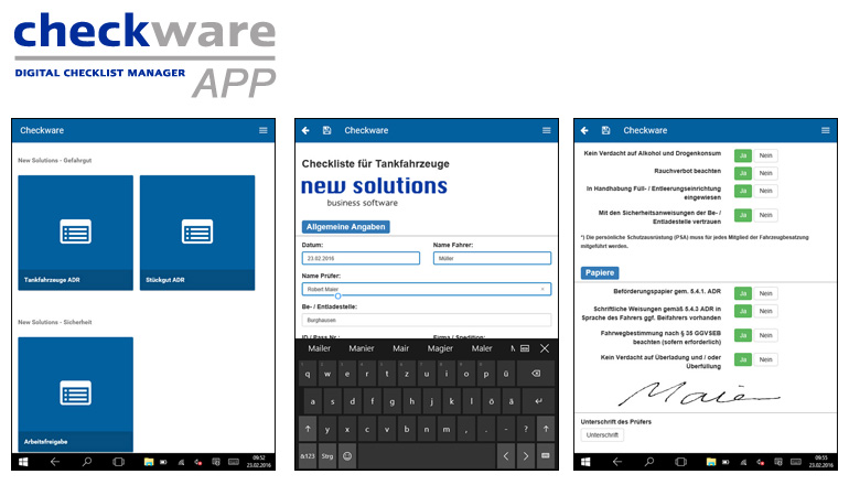Mit dem Programm Checkware Digital Checklist Manager können Anwender digitale Checklisten und dynamische Formulare ausfüllen, elektronisch unterschreiben und revisionssicher verwalten. New Solutions hatte die Software anfangs als Windows-Version angeboten; seit 2014 kann die plattformunabhängige, browserbasierte Programmversion von jedem mobilen oder stationären Endgerät genutzt werden.
