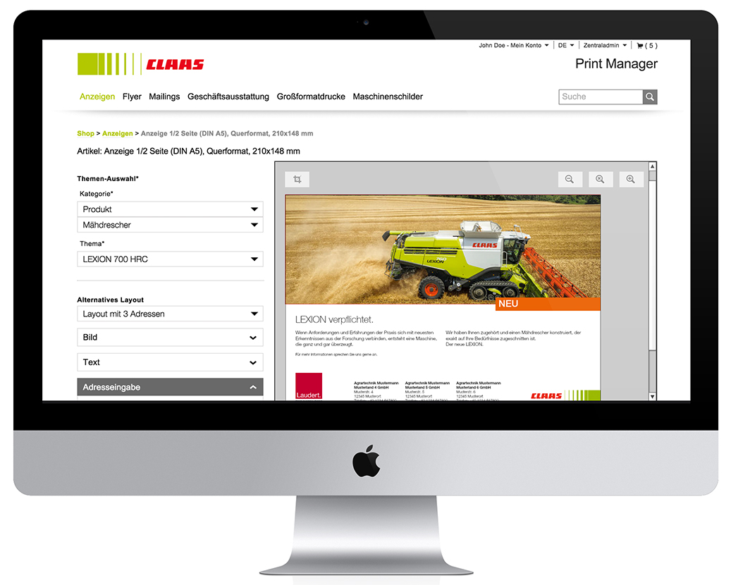 (IINews) - Das Unternehmen Claas gehört mit rund 11.000 Mitarbeitern zu den führenden Landmaschinenherstellern in ganz Europa. Im Bereich der Agrartechnik nimmt der Konzern internationale Spitzenplätze ein. Dieser Erfolg ist nicht zuletzt auf die Vertriebs- und Marketingaktivitäten zurückzuführen, die von der Group Marketing mit Sitz im ostwestfälischen Harsewinkel geplant und gesteuert werden. Schon vor mehreren Jahren hat das Team das Potenzial eines Web2Print (http://www.laudert.de/medien-it/laudertprintbase.html)-Systems erkannt und genutzt. Doch durch die Einführung eines neuen Systems wurde die Werbemittelproduktion nochmals optimiert. Der sogenannte Print Manager ist eine für Claas angepasste Enterprise-Lösung des LaudertPrintBase® (http://www.laudert.de/medien-it/laudertprintbase.html), mit der noch schneller und intuitiver produziert wird. Die Verbindung aus leistungsstarker Rendering Engine des Chili Publishers und den weitreichenden Shop-Funktionen des Oxid eShops bildet die Basis des intuitiven Web2Print-Systems.