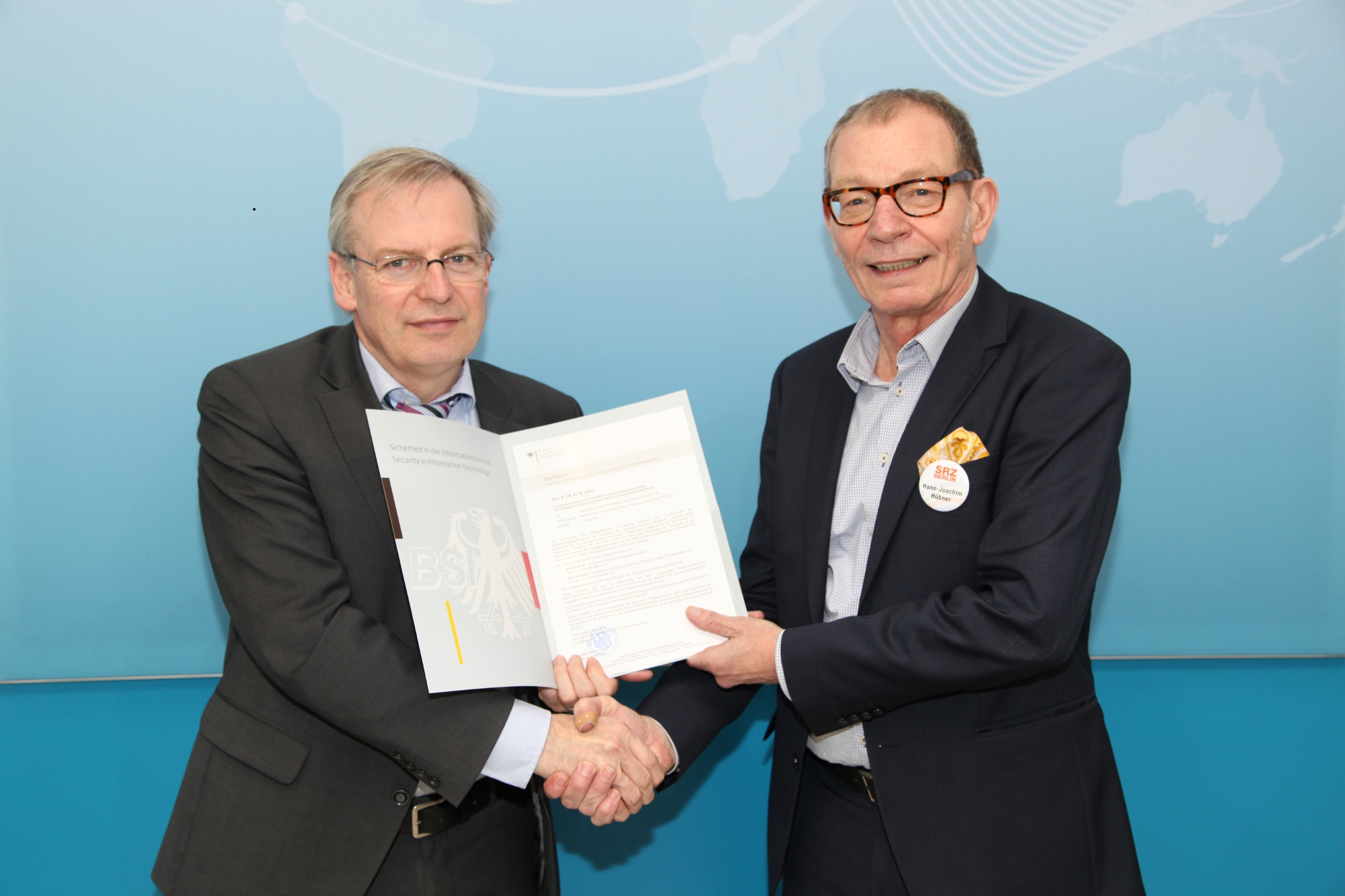 (IINews) - Als einer der ersten Dienstleister im Bereich der beweiswertsichernden Dokumentendigitalisierung, ist das SRZ nach den strengen TR-RESISCAN-Richtlinien des Bundesamts für Sicherheit in der Informationstechnik (BSI) erfolgreich auditiert worden. Anlässlich der CeBIT 2016 überreichte Bernd Kowalski, Abteilungsleiter Sichere elektronische Identitäten, Zertifizierung und Standardisierung dem SRZ-Verantwortlichen Hans-Joachim Hübner, Leiter Vertrieb und Systemintegration die Zertifizierungsurkunde.