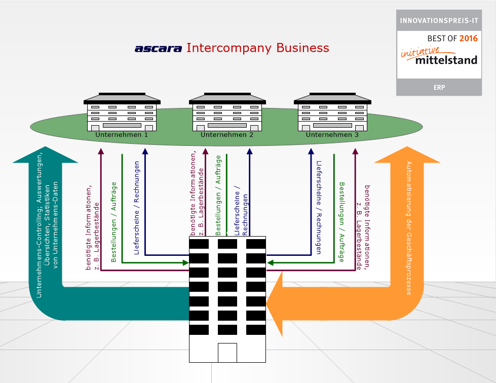 Die Innovationsstärke der Lösung begründet sich im Wachstumspotenzial für Mittelständler. Durch den modularen Aufbau der Unternehmenssoftware starten KMUs mit einer Zentrale und wachsen sukzessive. Bei Erweiterung der Unternehmensgruppe durch rechtlich selbstständige Firmen wächst die Software-Lösung mit. Komplexe Geschäftsstrukturen werden mittels des Moduls ascara Intercompany Business abgebildet und automatisiert. Ein echter Gewinn bei knappen Ressourcen im Mittelstand.