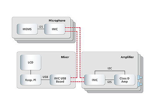 Die Demonstrationsanordnung enthält sechs Mikrofone, die ihre Audiosignale über sechs Monokanäle in das MOST Netzwerk leiten. Über zwölf Monokanäle bezieht der Mischer außerdem zwei 5.1-Ströme aus einer SD Card und mischt alle 18 Kanäle anschließend zu einem 5.1-Strom, den er an das MOST Netzwerk ausgibt. Drei Stereoverstärker übernehmen die Aufgabe, die vom Mischer erzeugten Signale an die Lautsprecher auszugeben.