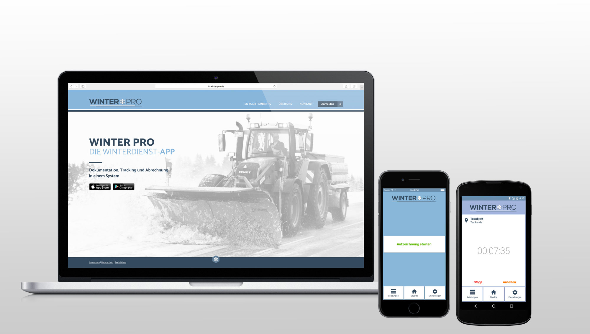 Die App "Winter Pro" ermöglicht es, die Leistungen im Winterdienst direkt per App zu dokumentieren. Kunden und Objekte wie Supermärkte, Parkplätze oder Straßen können hinterlegt werden, per GPS erkennt das Smartphone im Traktor dann den genauen Ort. Zusatzinformationen wie Salzverbrauch oder zusätzliche Leistungen können direkt in der App eingetragen werden. In der Zentrale können die Daten sofort in Rechnungen fakturiert werden. Für viele Kommunen ist es auch wichtig, dass die Winterdienst App sehr genau die Räumung und Streuung dokumentiert - schließlich besteht für die Kommunen eine Räumpflicht, die mit Winter pro detailliert und auf Jahre hinaus dokumentiert wird. Erhältlich ist die Winterdienst App für Android oder iOs Smartphones.