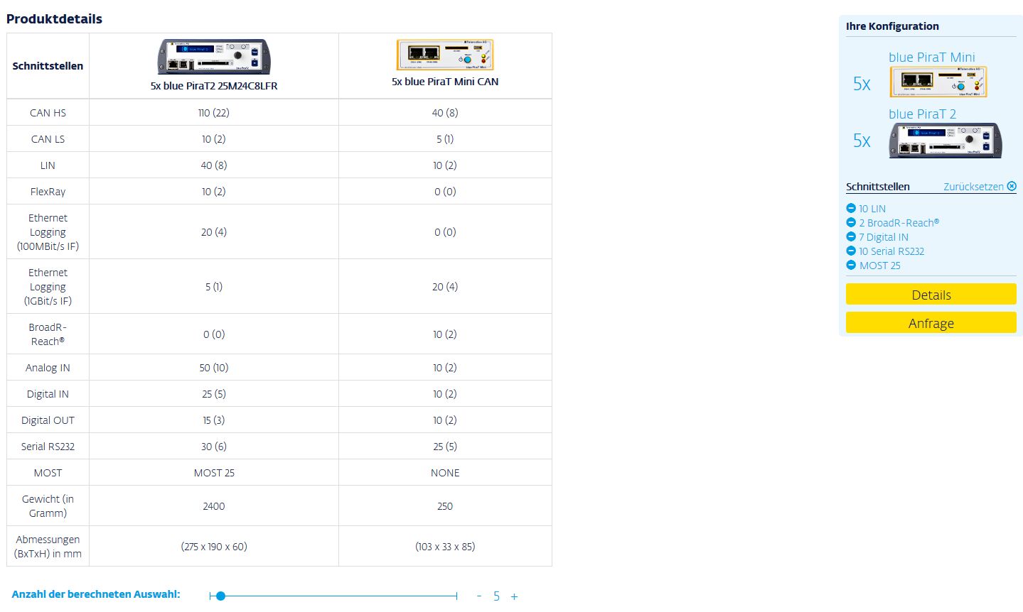 "Mit unserem Produktkonfigurator gelangen Interessenten schnell zum richtigen Produkt für ihre Anforderungen" sagt Markus Fischer, Vorstand für Marketing und Vertrieb bei Telemotive. "Langes Suchen ersparen wir ihnen." Der Nutzer gibt lediglich Art und Anzahl der benötigten Schnittstellen vor. Elf verschiedene Schnittstellen sind über komfortable Schieberegler auswählbar - von CAN über Ethernet bis hin zu MOST. Die passende Konfiguration ist sofort auf der gleichen Seite sichtbar. Neben Bildern der Produkte werden auch deren technische Daten angezeigt. Anschließend können Interessenten ein unverbindliches Angebot anfordern, weitere Informationen einholen oder um Rückruf bitten.