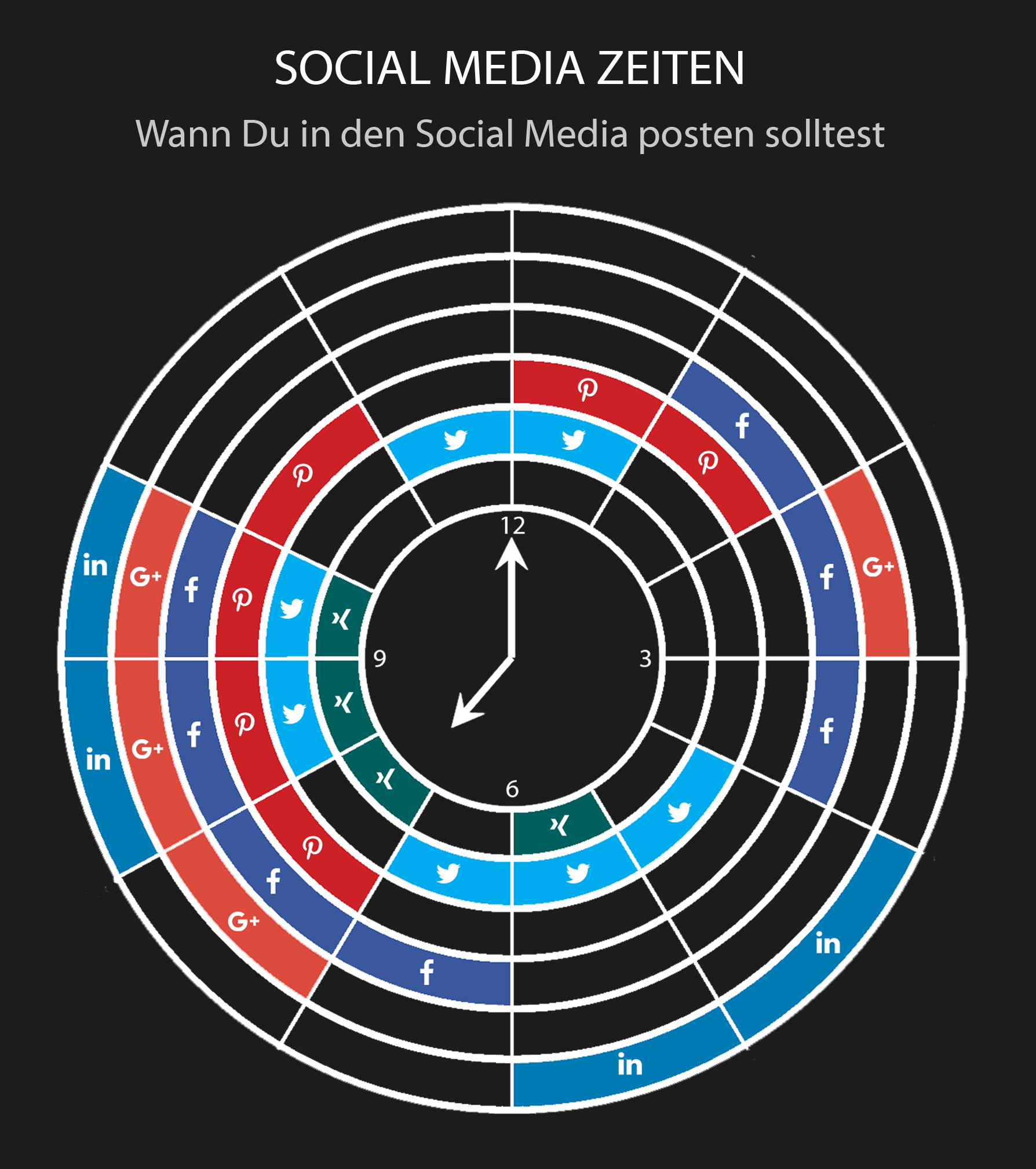 Der Zeitpunkt des Postens ist entscheidend für ein erfolgreiches Social Media Management. Untersuchungen zufolge ist vor den Bürozeiten, zwischen 7 und 10 Uhr und nach Büroschluss am Nachmittag, in der Zeit von 16 bis 19 Uhr auf Twitter, Xing und LinkedIn die höchste Interaktionsrate, während bei Facebook und Pinterest die meisten Nutzer Mittags und Abends ab 18 Uhr aktiv sind. Deshalb empfiehlt es sich, morgens den Fokus auf Xing und Twitter zu legen und abends Pinterest und Facebook aktiv zu bedienen.