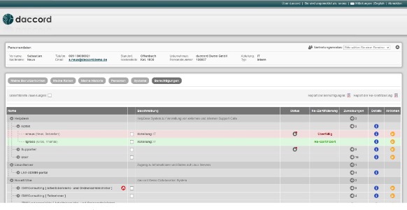 Die IT-Abteilung sieht auf einen Blick, ob wichtige Berechtigungen fehlen, Über- oder Unterberechtigungen bestehen oder (Ex-)Kollegen fälschlicherweise immer noch Zugriffsmöglichkeiten besitzen. Alle Benutzerkonten, Rechte, Rollen und die Historie der Mitarbeiter werden im Frontend übersichtlich angezeigt. Insbesondere die Historie ist eine hilfreiche Funktionalität, da sie chronologisch auflistet, wem wann und von wem welche Zugriffsrechte genehmigt wurden. Auch die letzten Änderungen in Benutzerkonten werden von daccord lückenlos dokumentiert.