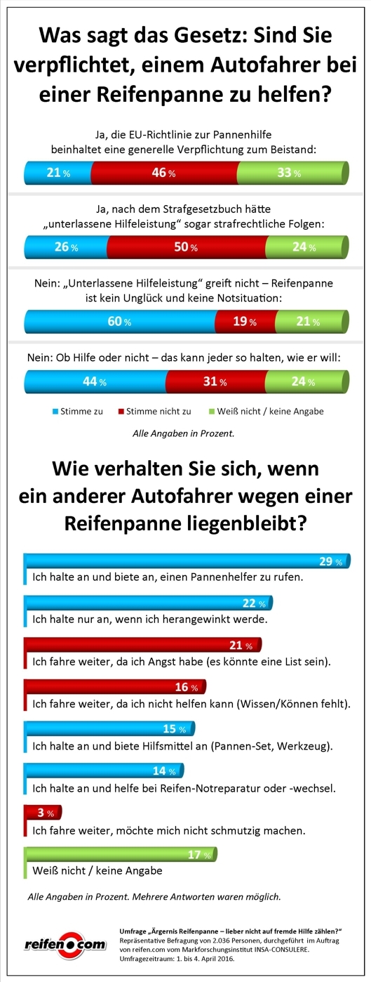 (IINews) - Bielefeld/Hannover, 21. April 2016. In puncto Reifenpannen-Hilfe herrscht bei Deutschlands Autofahrern große Konfusion: Knapp 26 Prozent sind der irrigen Annahme, dass sie anderen Autofahrern bei einer Reifenpanne helfen müssen und Nichthilfe sogar strafrechtliche Folgen hätte ("unterlassene Hilfeleistung"). 21 Prozent glauben sogar, dass es eine "EU-Richtlinie zur Pannenhilfe" gäbe - mit genereller Verpflichtung zum Beistand. Dies ist das Ergebnis einer repräsentativen Umfrage im Auftrag des Reifenfachdiscounters reifen.com ( http://www.reifen.com ).