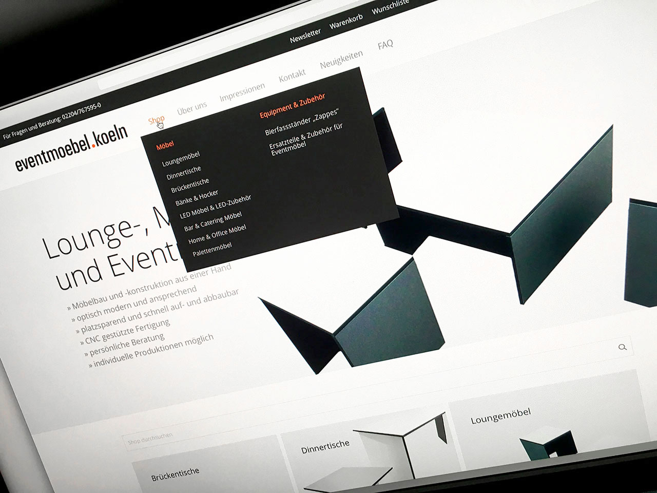 Im Vordergrund stehen Produktbilder und Details zur Verarbeitung, Materialien und einer verbesserten Benutzerführung. Die direkte Kontaktmöglichkeit unter jedem Produkt ermöglicht in nur wenigen Schritten eine exklusive Anfrage für ein Wunschprodukt. Damit möchte eventmoebel.koeln den Einkauf ohne zwingend erforderliche Beratung so einfach und angenehm wie möglich machen.