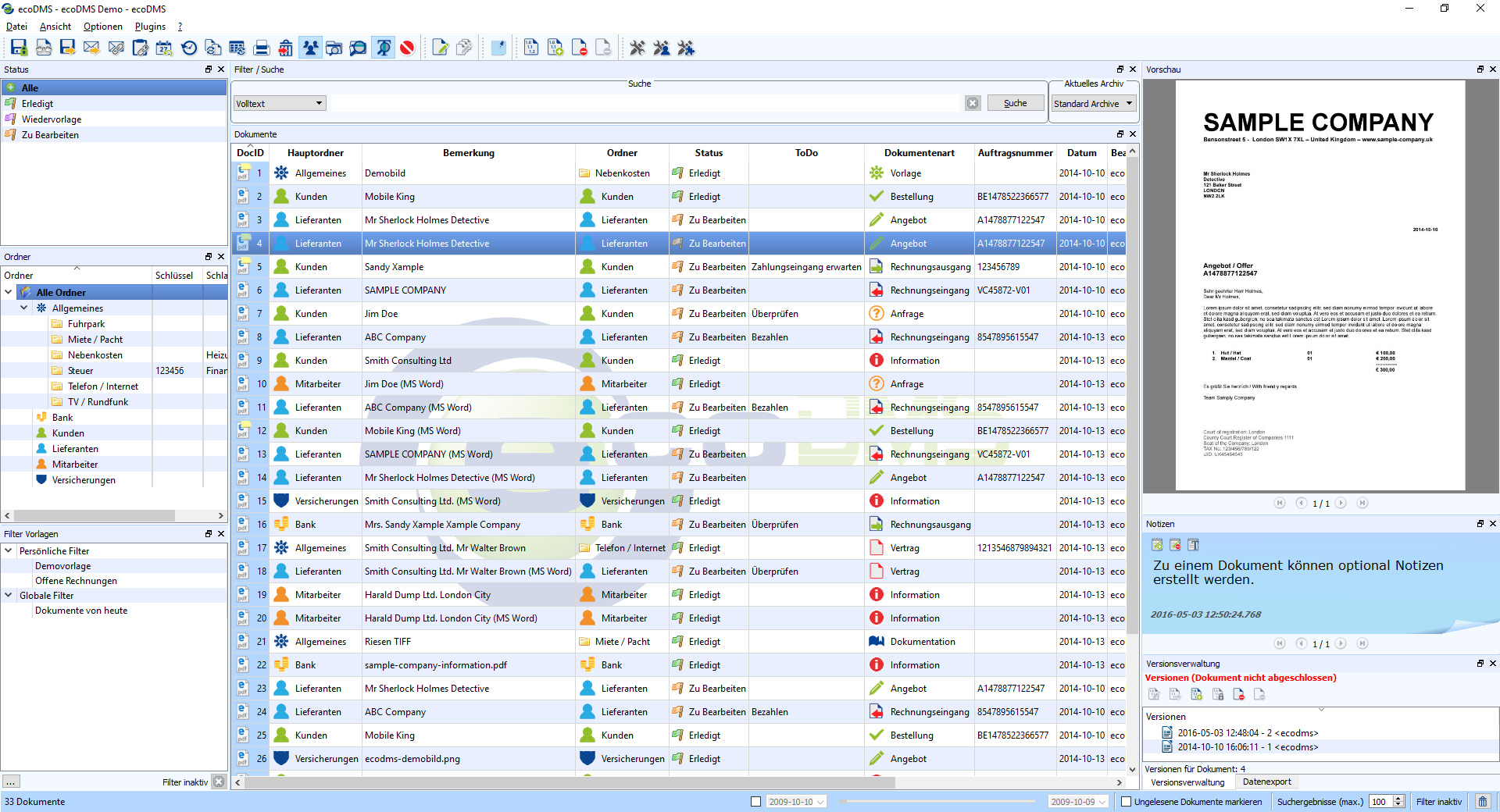 Beliebige Papierdokumente und digitale Daten können mit dieser DMS-Lösung revisionssicher in einem zentralen Archiv gespeichert, professionell verwaltet und in Sekundenschnelle wiedergefunden werden. Ein leistungsfähiger Erkennungsassistent macht dabei eine automatische Zuordnung und Archivierung der Dateien möglich. Papier wird einfach via Scanvorgang an ecoDMS übergeben. Digitale Daten wie E-Mails, Anschreiben, Tabellen, Verträge, Rechnungen und vieles mehr finden mit wenigen Mausklicks ebenfalls schnell den Weg ins Archiv. Für MS Office, OpenOffice und LibreOffice beinhaltet die ecoDMS Vollversion zusätzlich eigene Plug-ins. Diese erlauben eine direkte Archivierung als PDF/A und Originaldokument aus den jeweiligen Anwendungen. Die Originaldatei kann auf Wunsch weiter bearbeitet und als neue Version gespeichert werden. Auch für Thunderbird und Outlook steht ein Add-on für die komfortable E-Mail Archivierung bereit.