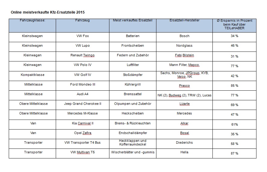 Die folgende Tabelle führt nach Fahrzeugklasse geordnet jeweils einen Auszug der Autos auf, für die im Jahr 2015 die meisten Ersatzteile über den Online-Marktplatz TEILeHABER bestellt wurden.