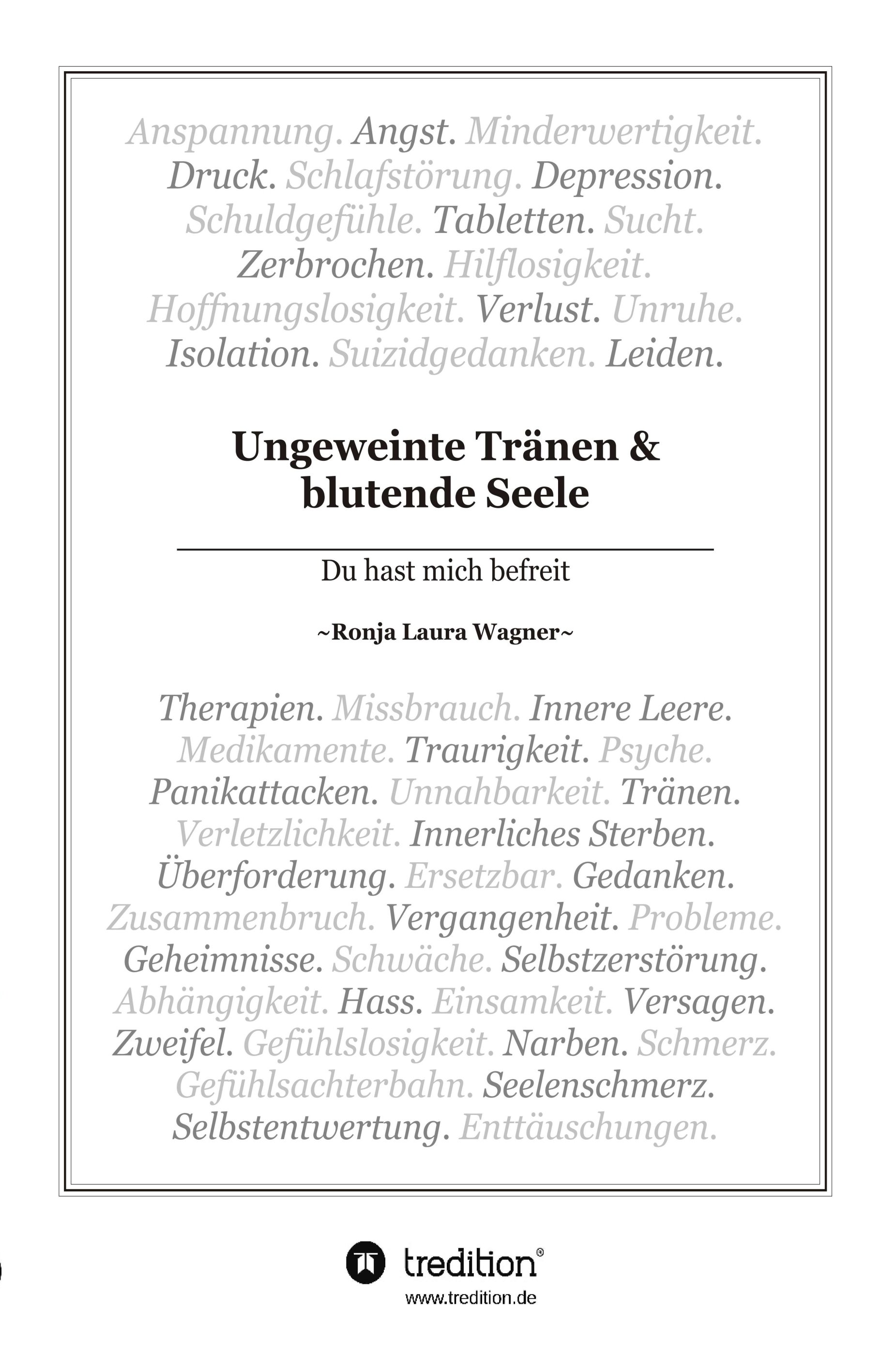 Mit ihrer bewegenden Autobiographie "Ungeweinte Tränen und blutende Seele" schafft Ronja Laura Wagner ein Buch, das anderen Mädchen und Frauen in ähnlichen Situationen Mut machen und sie zum Handeln auffordern will. Ronja Laura Wagners Buch ist mutig, denn viele Frauen schämen sich für die Dinge, die in ihrem Leben ohne ihr eigenes Verschulden geschehen sind. Das Buch richtet sich daher vor allem an Frauen, die in ihrem Leben sexuell missbraucht wurden und/oder an Depressionen leiden, und an deren Freunde und Angehörige, die die Frauen besser verstehen möchten.