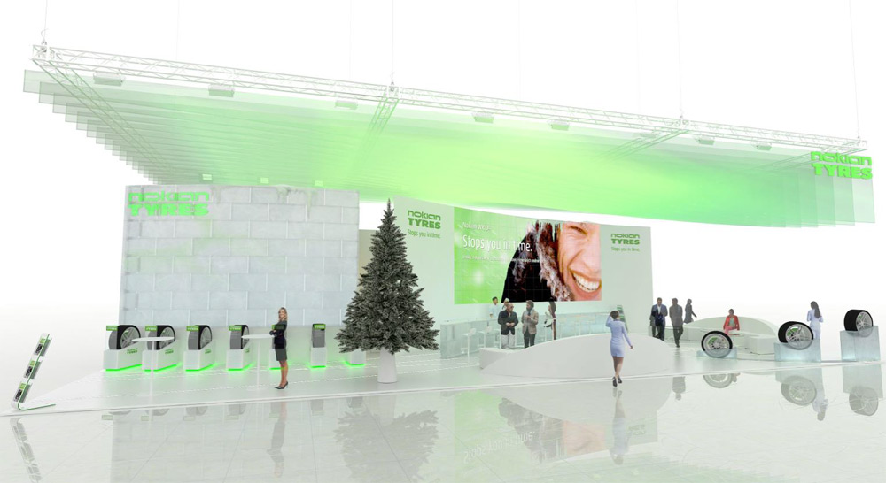 Die modernen Technologien und Verfahren, die bei der Entwicklung und Herstellung der Reifen eingesetzt werden, spiegeln sich auch in dem Stand-Design wieder. Eine riesige, 30 m2 große LED-Wand dominiert hier und strahlt das Polarlicht aus, das von speziellen, sich bewegenden Deckenplatten reflektiert wird. Die Eis-Bar lädt zu Gesprächen mit den Nokian Tyres Mitarbeitern ein.