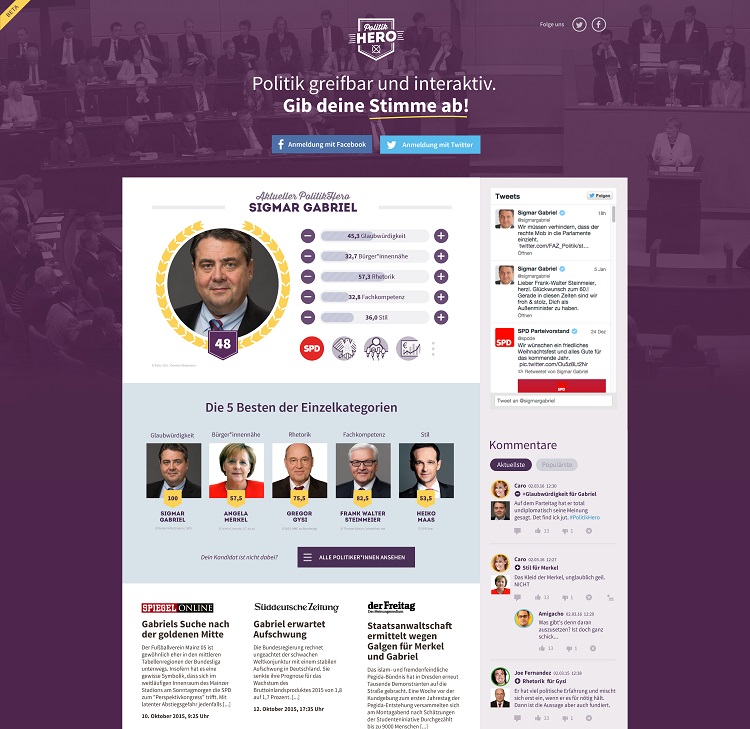 Im Netz gibt fast nichts, das nicht bewertet werden kann und wird: Restaurants, Museen, Transaktionen, Kleidung, Hotels und die Statements der Facebook-Freunde. Allein für das Handeln der politischen Akteure steht bisher keine eigenständige Plattform zur Verfügung - und das obwohl sich der Wunsch nach politischem Austausch an vielen Stellen wiederspiegelt, ob in den Kommentarspalten politischer Onlinemagazine oder am Stammtisch. Genau hier setzt PolitikHERO an und schafft ein Forum, in dem das Meinungsbild online gebündelt wird. User vergeben Punkte, um die "Fähigkeiten" der Parlamentarier einzuschätzen. Mit dem Einsatz von Gamification-Elementen sorgt die Plattform für niedrigschwellige politische Partizipation.