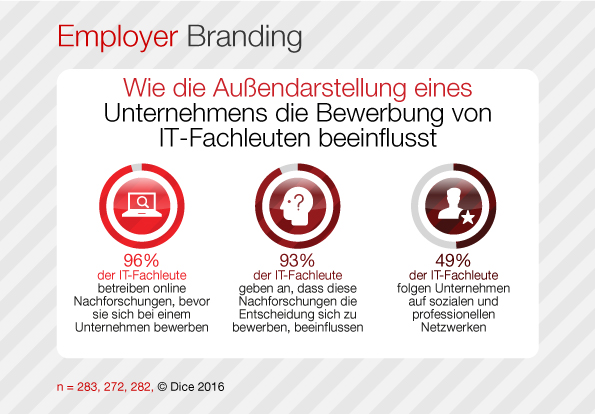 (IINews) - Frankfurt am Main, 7. Juni 2016. Die Außendarstellung von Unternehmen im Netz hat großen Einfluss darauf, ob sich Technologie-Fachleute bei ihnen bewerben. Das ergab der jährlich erscheinenden Job Market Report von Dice (http://de.dice.com), der Online-Karriereseite für Technologieberufe. Befragt wurden 323 Technologie-Spezialisten aus Deutschland. Demnach informieren sich 96 Prozent von ihnen im Netz, bevor sie sich bei einem Unternehmen bewerben. Bei 93 Prozent beeinflusst das Ergebnis der Recherche, ob sie ihre Unterlagen anschließend auch einreichen.