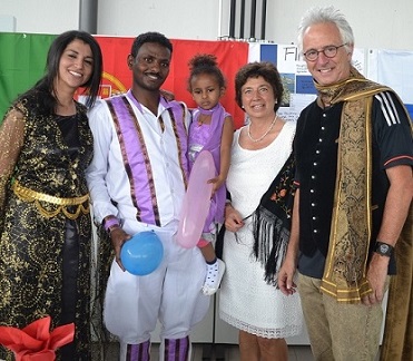 Ein großgewachsener Erstsemester aus Bayern zeigte sich in einer schmucken Krachledernen. Dazu gehören traditionell die in aufwendiger Ornamentik bestickten Hosenträger aus Hirschleder. Zusammen mit den haut-zeigenden Wollstrümpfen, Loferl genannt, ein echter Hingucker. Manch angehender Bachelor wurde erst nach mehrmaligem Hinsehen als derjenige erkannt, der er wirklich ist. In seiner Landestracht ist auch Tesfai gekleidet. Er kommt aus Eritrea und hat seine zweijährige Tochter zum Festival mitgebracht, die er stolz auf dem Arm trägt. Tesfai ist einer derjenigen Studenten, die im Rahmen des HdWM-Flüchtlings-Projektes „Study & Work“ im April ein Studium in IT Management aufgenommen haben.
