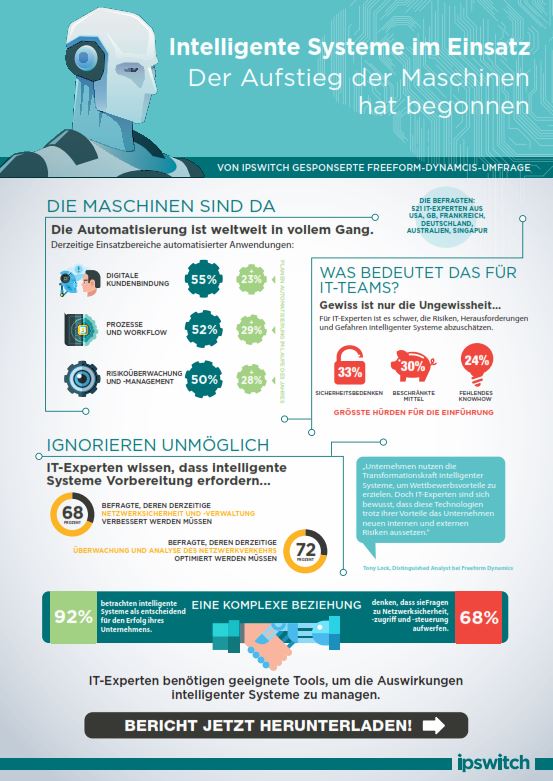 Der vollständige Bericht mit dem Titel "Intelligent Systems in Action: The Rise of the Machines Has Already Begun" (Intelligente Systeme im Einsatz: Der Aufstieg der intelligenten Maschinen hat bereits begonnen) kann zusammen mit einer Infografik hier (https://www.ipswitch.com/blog/wp-content/uploads/2016/06/Intelligent-Systems-in-Action_Ipswitch-survey-report.pdf?source=Content&details=PR) heruntergeladen werden.