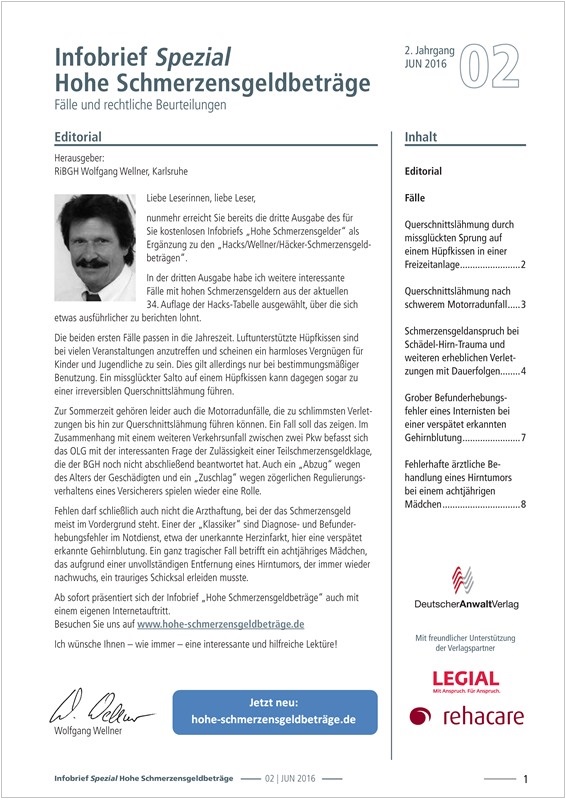 Der Infobrief "Hohe Schmerzensgeldbeträge" erscheint regelmäßig alle 3 Monate und kann gratis unter dem nachstehenden Link bezogen werden: www.anwaltverlag.de/hohe-schmerzensgelder (https://www.anwaltverlag.de/hohe-schmerzensgelder).