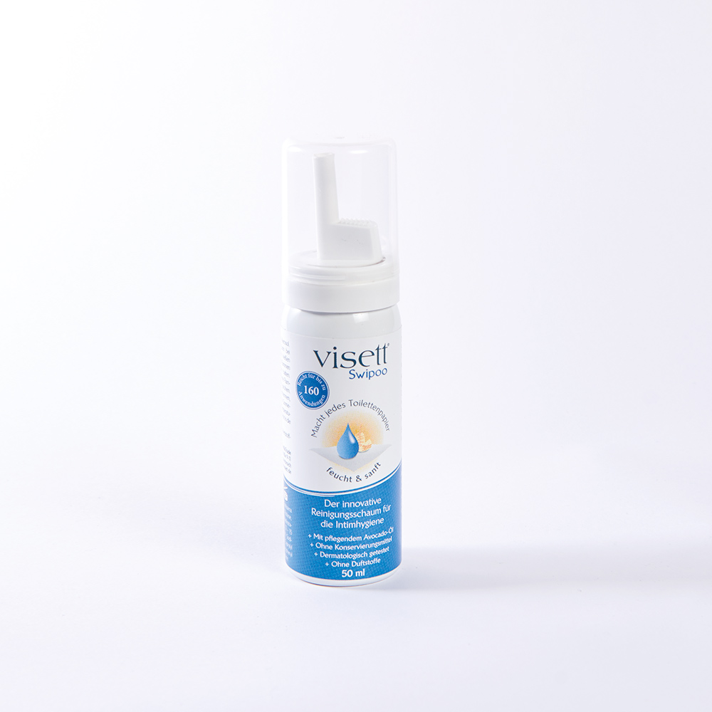 visett Swipoo ist definitiv die bessere Alternative zu feuchtem Toilettenpapier, denn die hygienische Pflege wird absolut erfüllt und der Schaum ist extrem sparsam in der Verwendung. Dank der kompakten Flaschengröße passt visett swipoo in jede Tasche und ist unterwegs, beispielsweise auf der Autobahnraststätte, einfach ideal. Zudem kommt, dass sich herkömmliches feuchtes Toilettenpapier oder ausgetrocknete Packungen schlechter zersetzen und die Abwasserkanäle verstopfen. Natürlich ist auch der Gebrauch des innovativen Schaums easy. Einfach die Flasche vor dem Gebrauch gut schütteln und eine kleine Menge direkt auf das Toilettenpapier sprühen. Und schon ist das eben noch trockene Papier feucht und kann zur erfrischenden und sicheren Reinigung der Analregion verwendet werden. So können mit der kleinen Reisegröße über 160 Anwendungen getätigt werden.