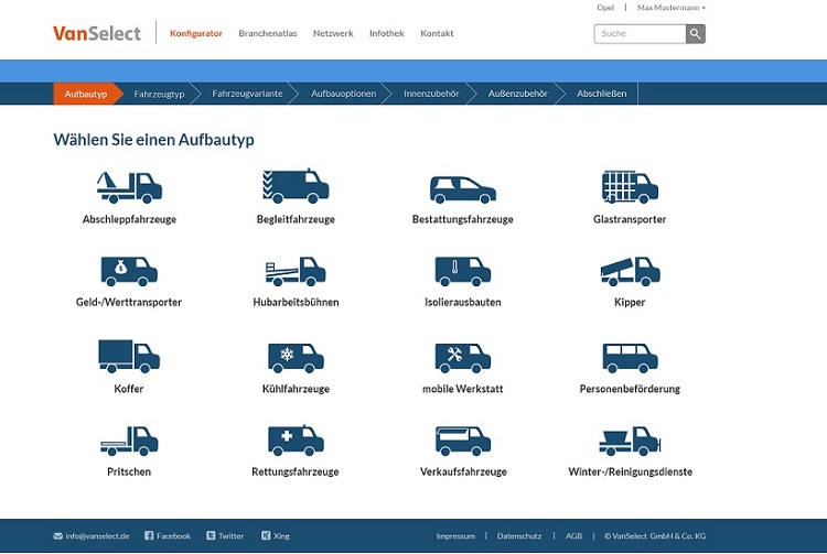 VanSelect bietet über sein Vergleichsportal den bundesweiten Zugriff auf Hersteller von Auf- und Umbauten im leichten Nutzfahrzeugbereich an. Über einen Online-Konfigurator lassen sich dazu die gewünschten Anforderungen zusammenstellen und anschließend hersteller- und kostenseitig vergleichen. Enthalten sind dabei ebenso Angaben zum Gewicht der Aufbauten, den Bezugsquellen, Garantien und Leistungen des Service-Netzes. Alle wesentlichen Details lassen sich so über VanSelect direkt online klären. Bisher als Service- und Umsatz-Katalysator auf den B2B-Markt ausgerichtet, öffnet sich VanSelect zur IAA Nutzfahrzeuge 2016 nun auch Endkunden.