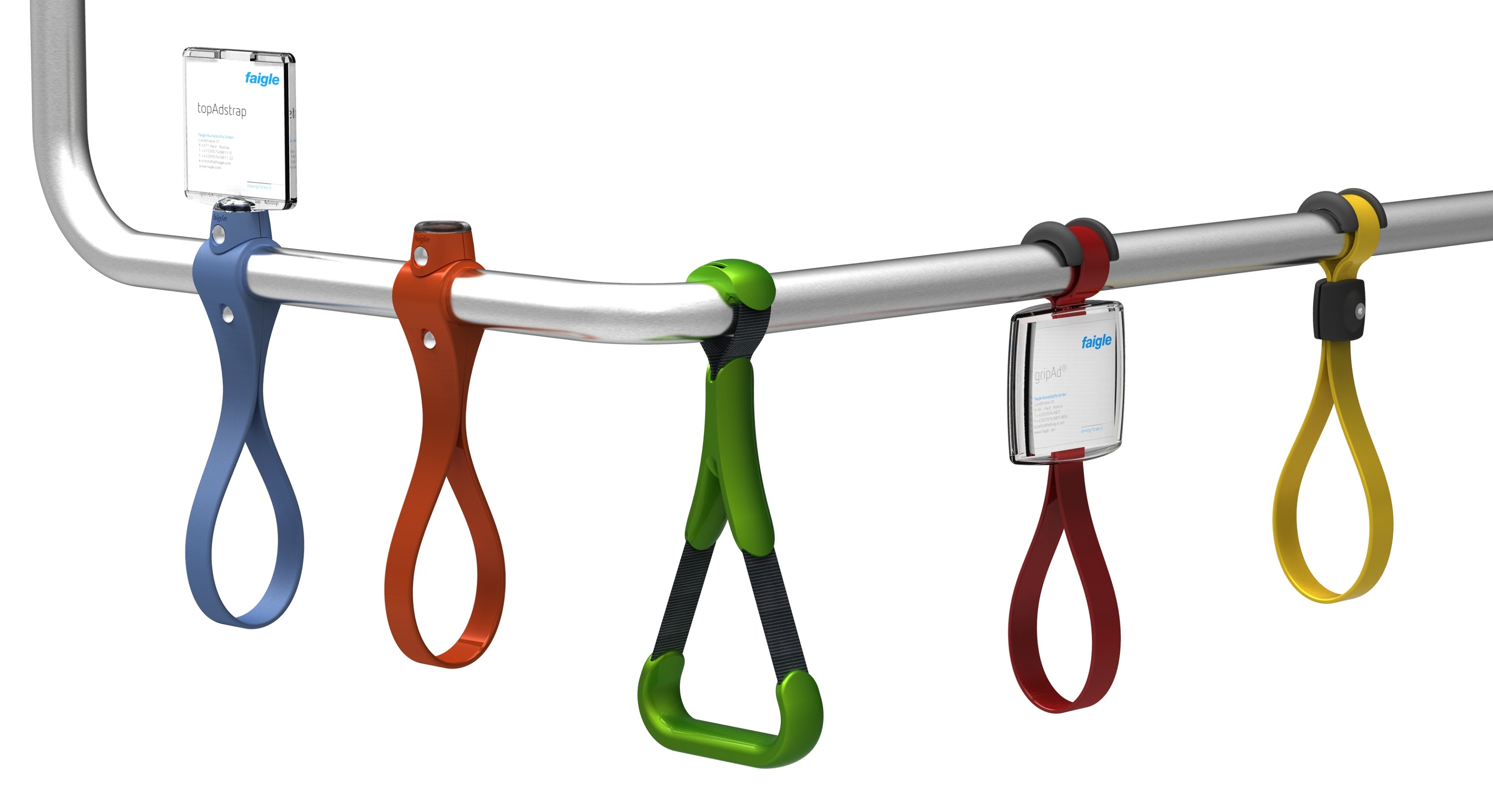 Beim Modell gripAd ist der Klemmteil als Werbefläche ausgeführt. So liegen die Halteschlaufen nicht nur gut in der Hand, sondern werden immer öfter auch zum Blickfang in Bussen und Schienenfahrzeugen. In ein integriertes transparentes Sichtfenster lässt sich werkzeuglos und ohne zusätzlichen Aufwand eine Werbebotschaft einschieben. Mit Werbung amortisiert sich die Anschaffung für den Verkehrsbetrieb schnell. gripAd ist in fünf Farbvarianten erhältlich. So werden Halteschlaufen von faigle immer mehr auch zu einem aktiven Gestaltungselement im Innendesign von Bussen und Schienenfahrzeugen.