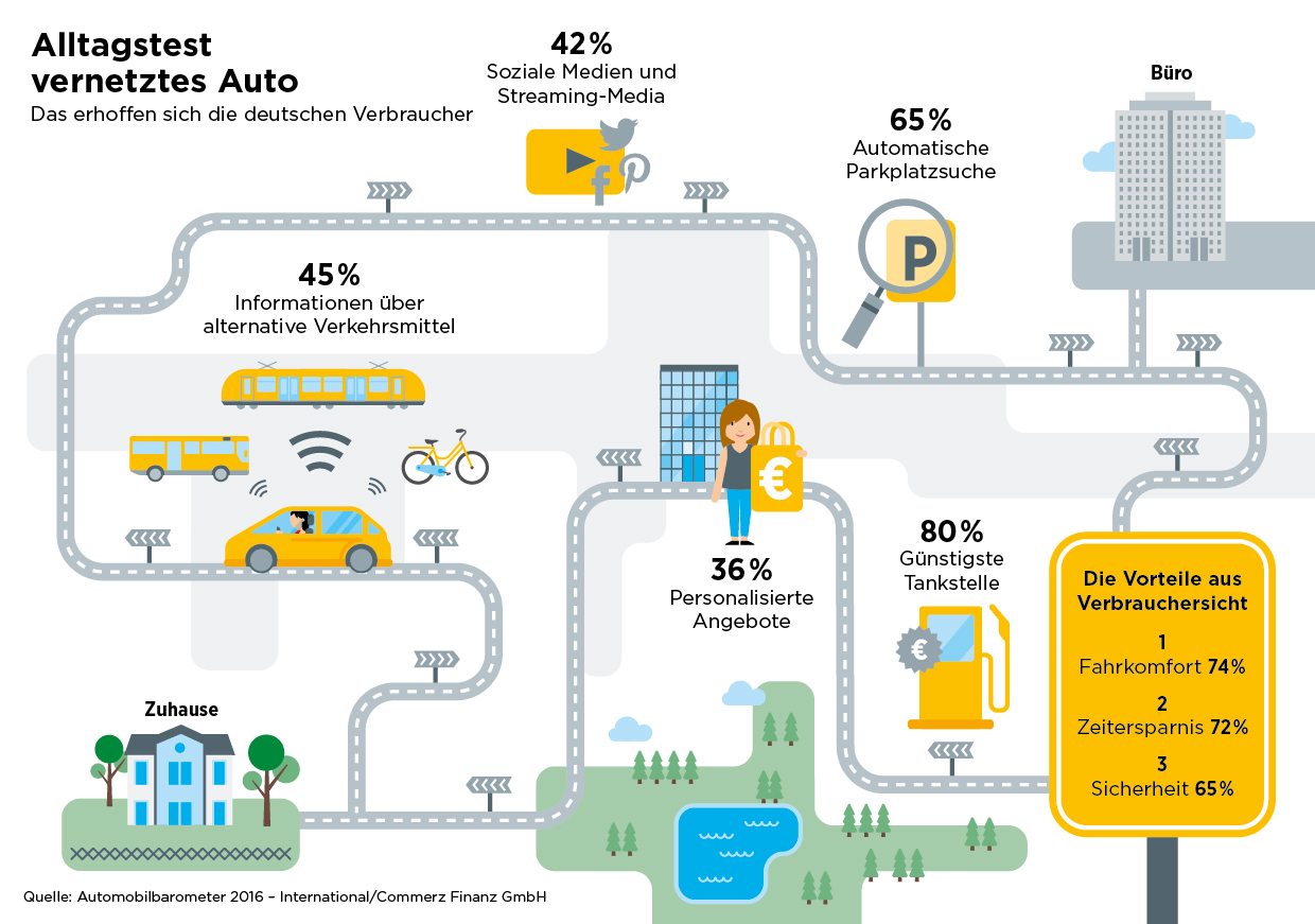 Das Automobilbarometer 2016 - International untersucht die Perspektive der Verbraucher auf das vernetze und autonome Auto. Neben den Erwartungen und Wünschen werden auch die mit dem intelligenten Fahrzeug verbundenen Bedenken genauer beleuchtet. Die Studie wird von der Commerz Finanz GmbH herausgegeben und wurde in Zusammenarbeit mit dem Marktforschungs- und Beratungsunternehmen BIPE realisiert. Sie basiert auf einer repräsentativen Online-Befragung, die TNS-Sofres im Juli 2015 durchgeführt hat. Zu Wort kamen dabei mehr als 8.500 Verbraucher aus Belgien, Deutschland, Frankreich, Großbritannien, Italien, Polen, Portugal, Spanien, der Türkei sowie Japan, den USA, Brasilien, China und Südafrika.